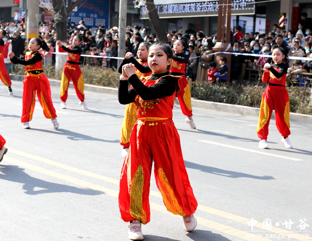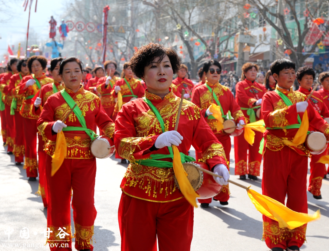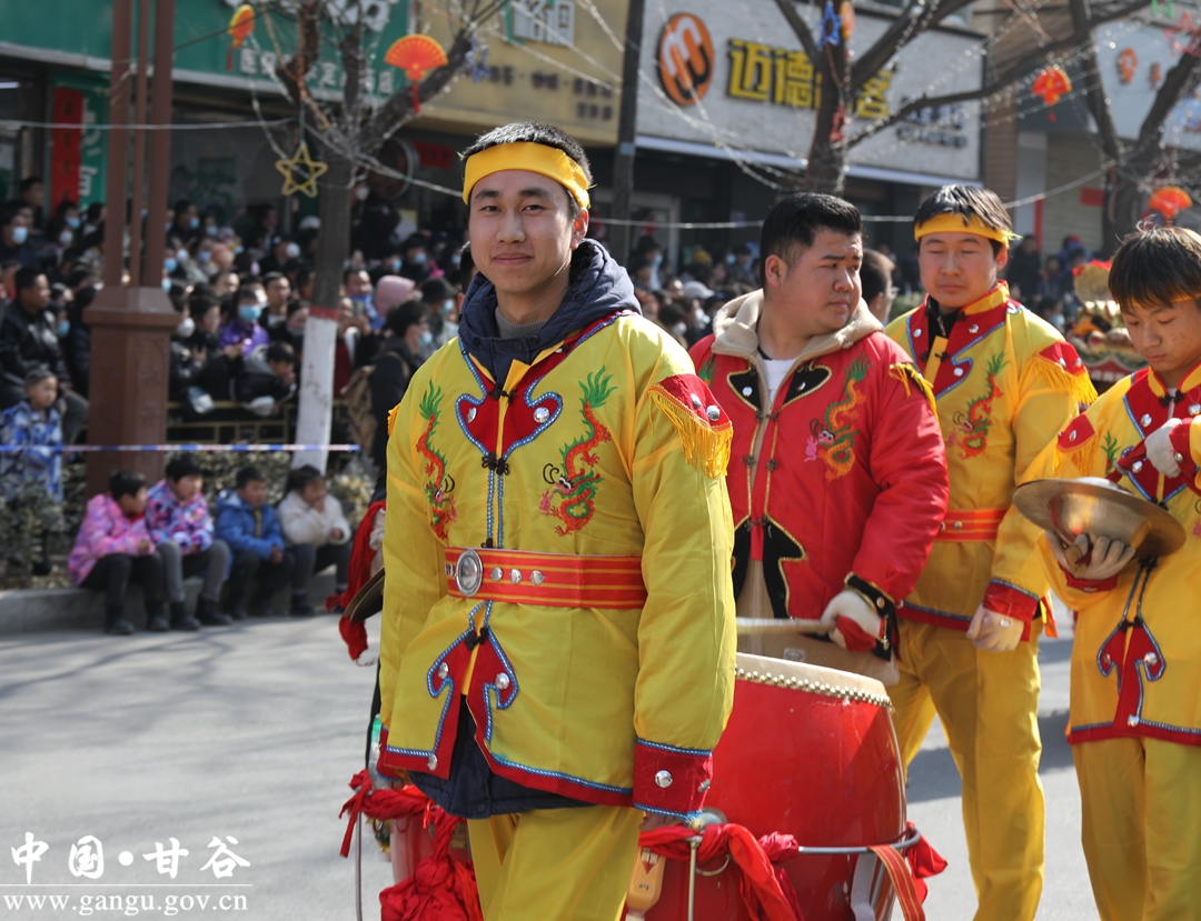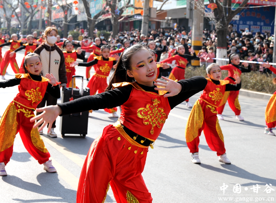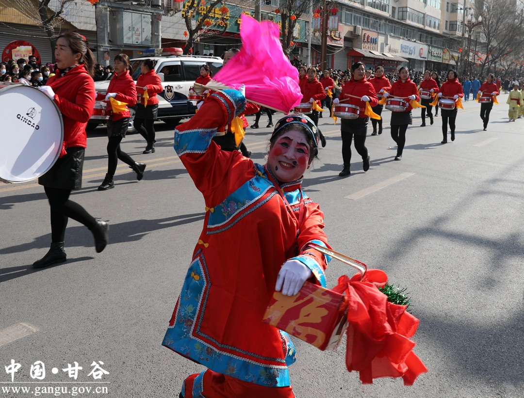 演员们个个喜笑颜开,身着华丽的服饰,精神抖擞、神采飞扬,随着喜庆的歌声舞动着身躯,排踩着欢快的鼓点相继亮相。大气磅礴的太平鼓、辗转腾挪的舞狮、独具特色的旱船、风趣诙谐的舞蹈、花团锦簇的彩车轮番上演,闹红了甘谷的正月天,也闹出了一个多姿多彩、有声有色的新春佳节。