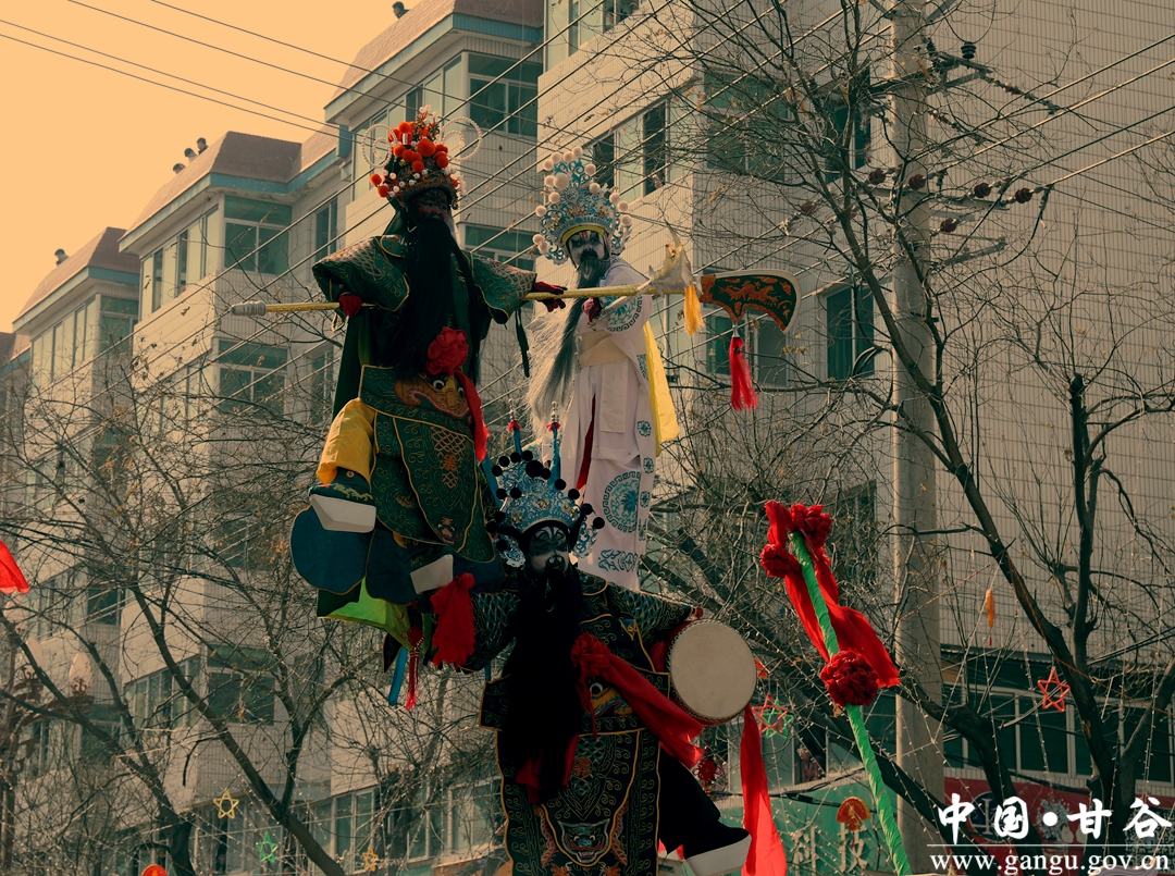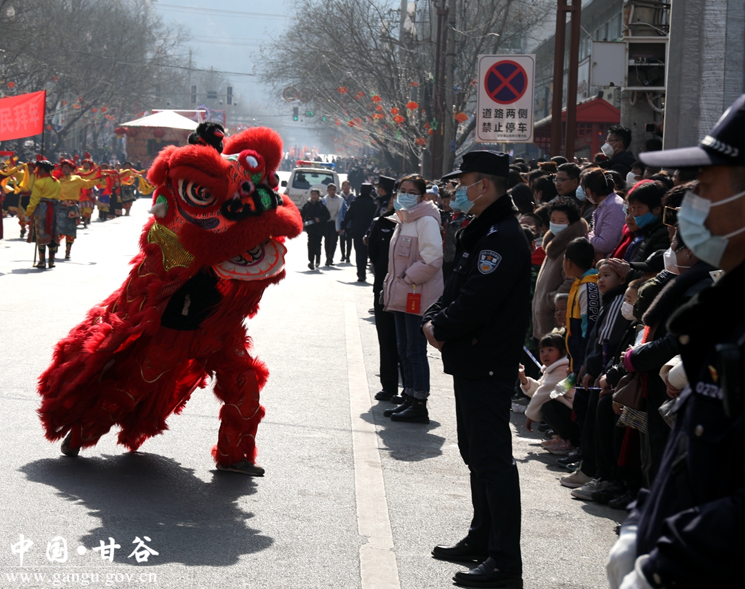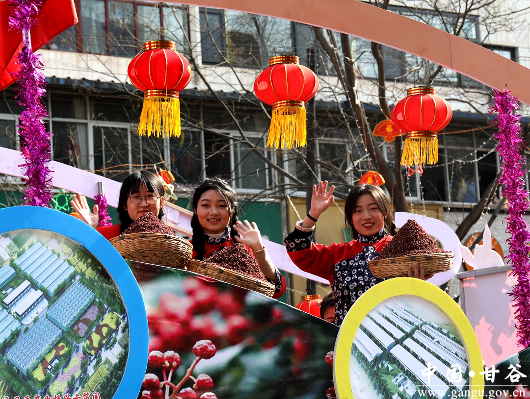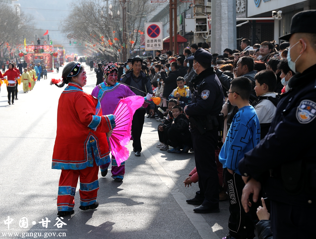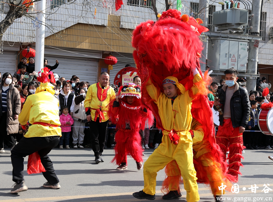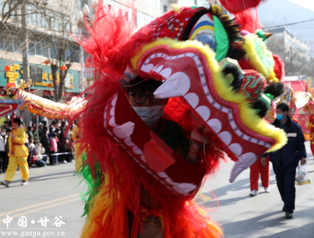 演员们个个喜笑颜开,身着华丽的服饰,精神抖擞、神采飞扬,随着喜庆的歌声舞动着身躯,排踩着欢快的鼓点相继亮相。大气磅礴的太平鼓、辗转腾挪的舞狮、独具特色的旱船、风趣诙谐的舞蹈、花团锦簇的彩车轮番上演,闹红了甘谷的正月天,也闹出了一个多姿多彩、有声有色的新春佳节。