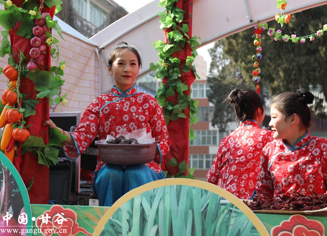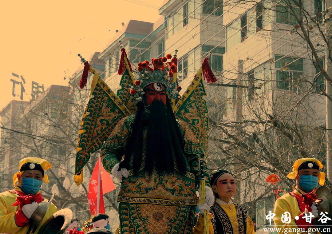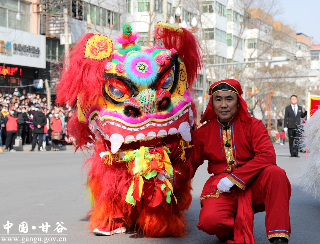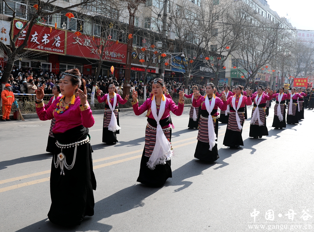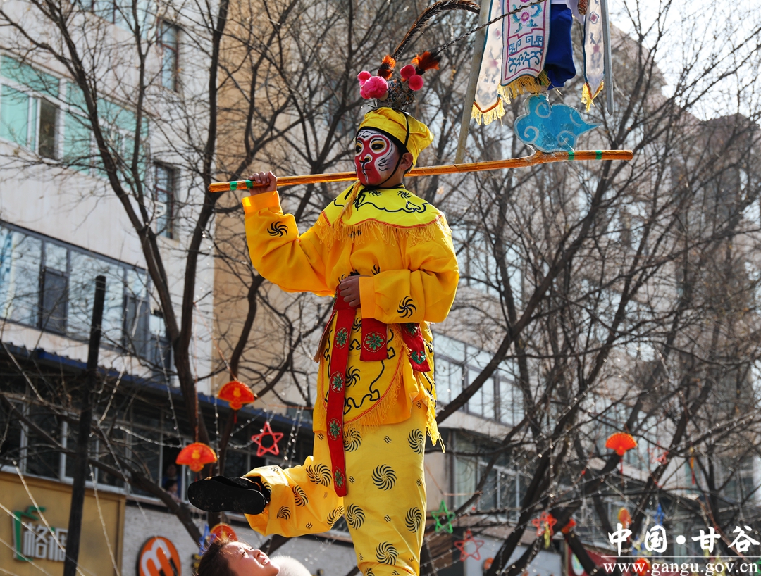 演员们个个喜笑颜开,身着华丽的服饰,精神抖擞、神采飞扬,随着喜庆的歌声舞动着身躯,排踩着欢快的鼓点相继亮相。大气磅礴的太平鼓、辗转腾挪的舞狮、独具特色的旱船、风趣诙谐的舞蹈、花团锦簇的彩车轮番上演,闹红了甘谷的正月天,也闹出了一个多姿多彩、有声有色的新春佳节。