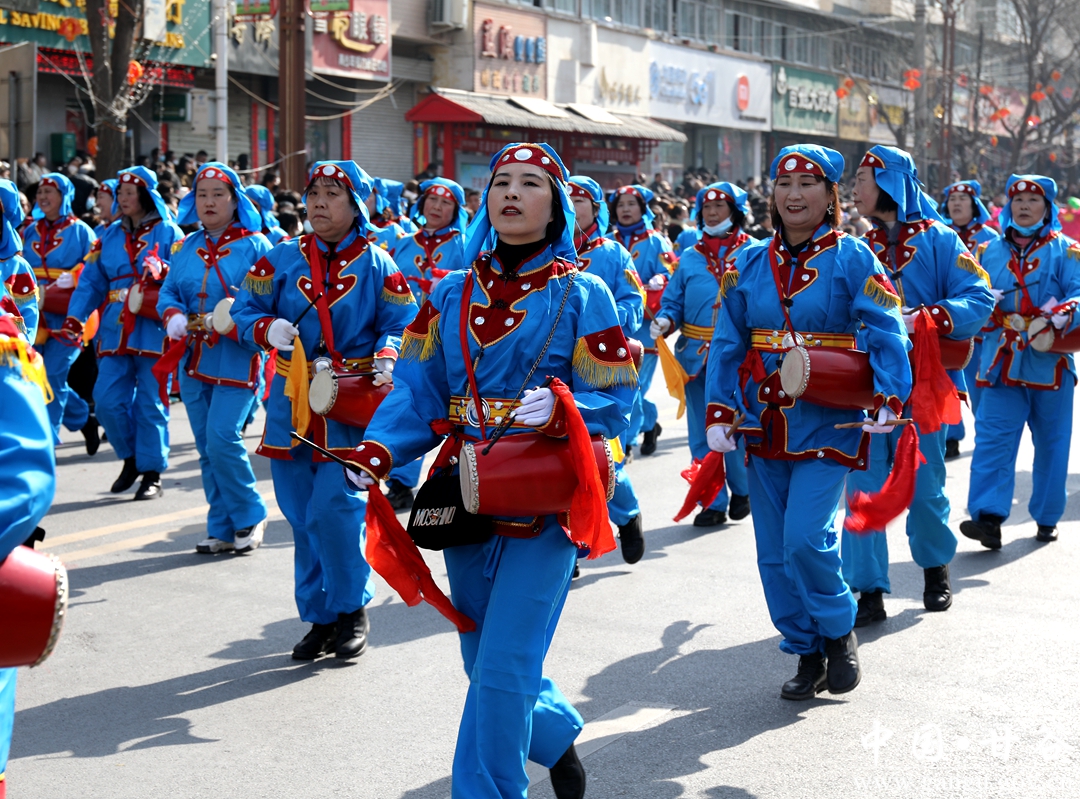 下午一时许,伴随着欢快喜庆的旋律,由乡镇、单位、企业组织的秧歌队从南关十字开始,自南向北沿新城路行进式表演了100多个丰富多彩的社火节目。