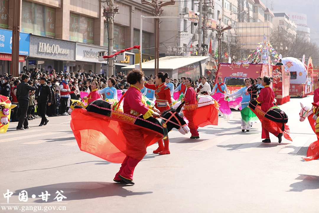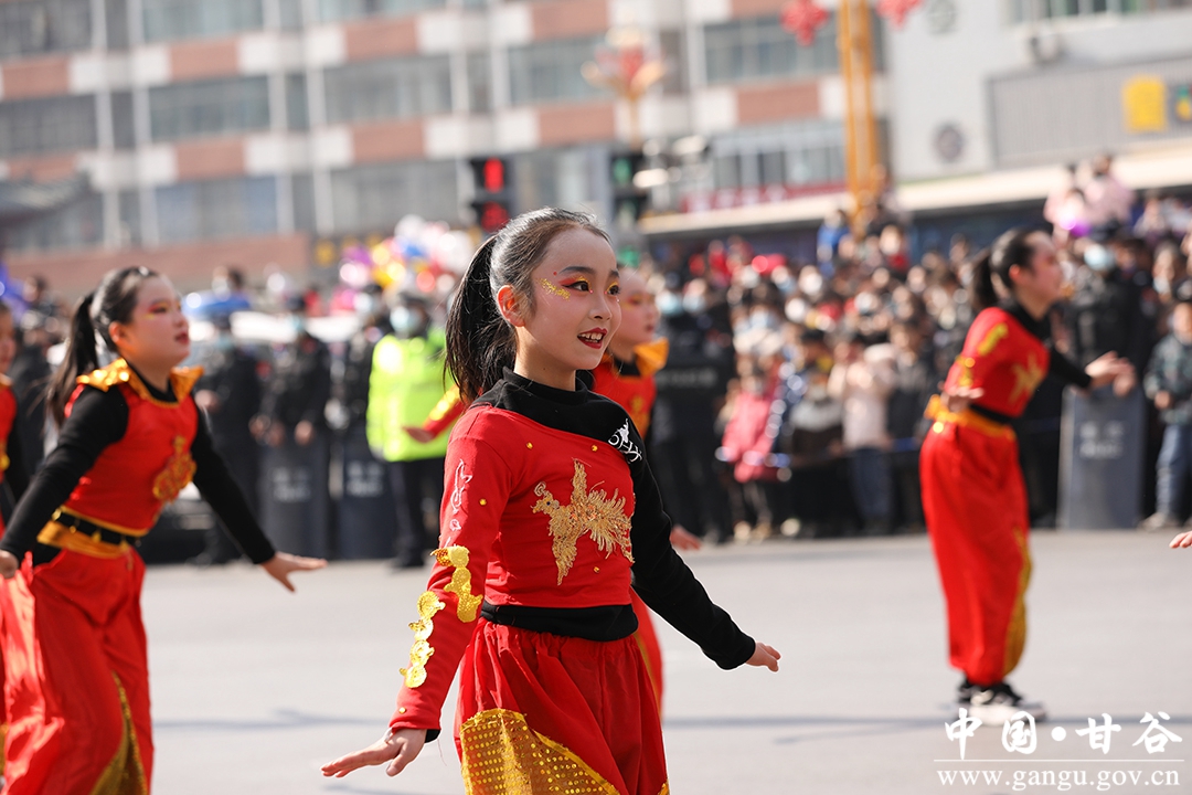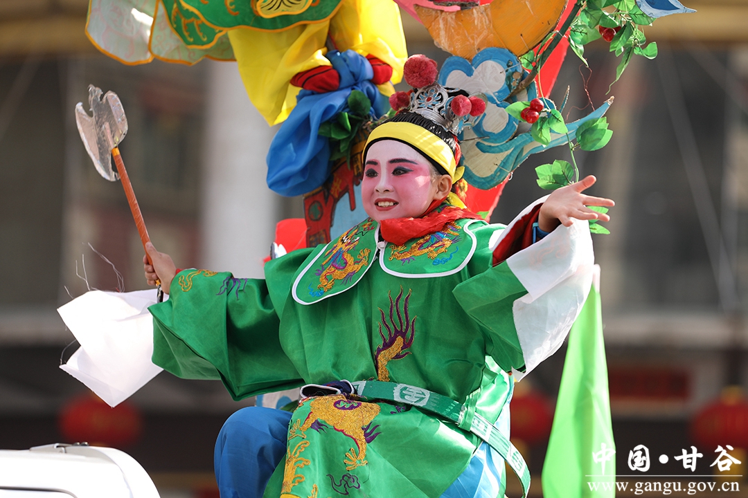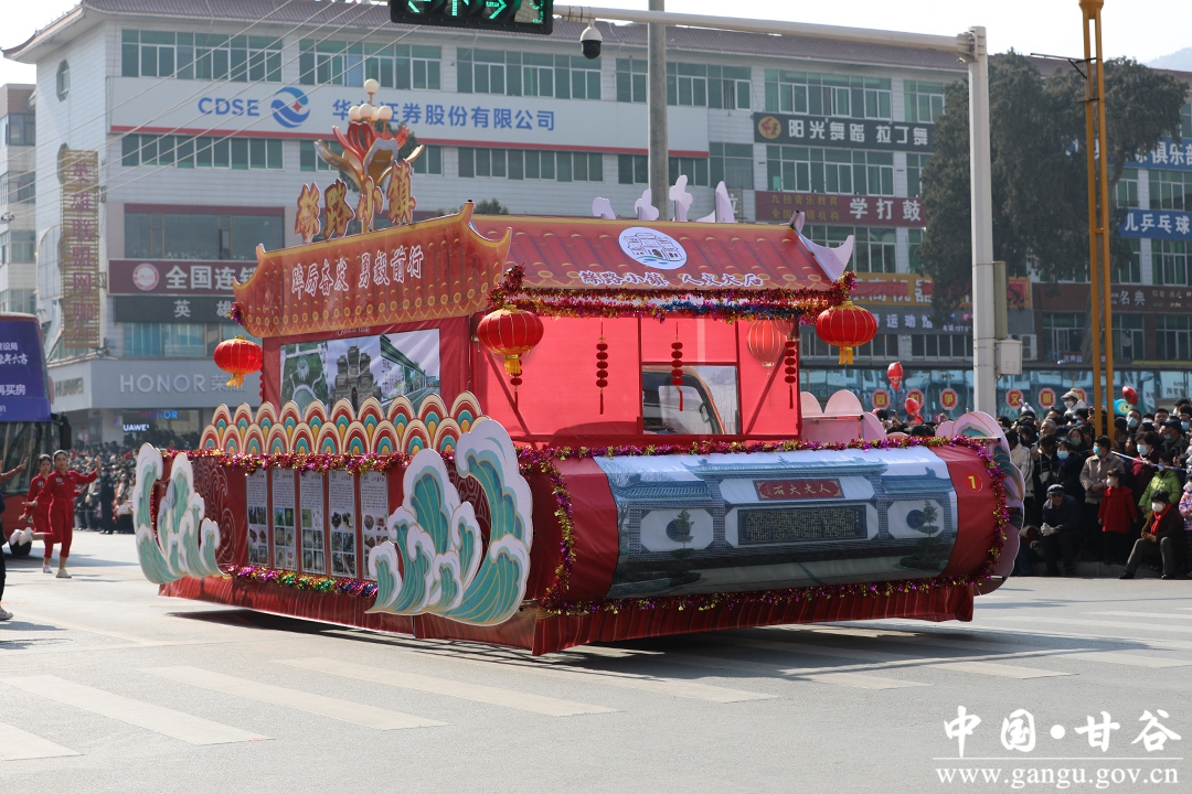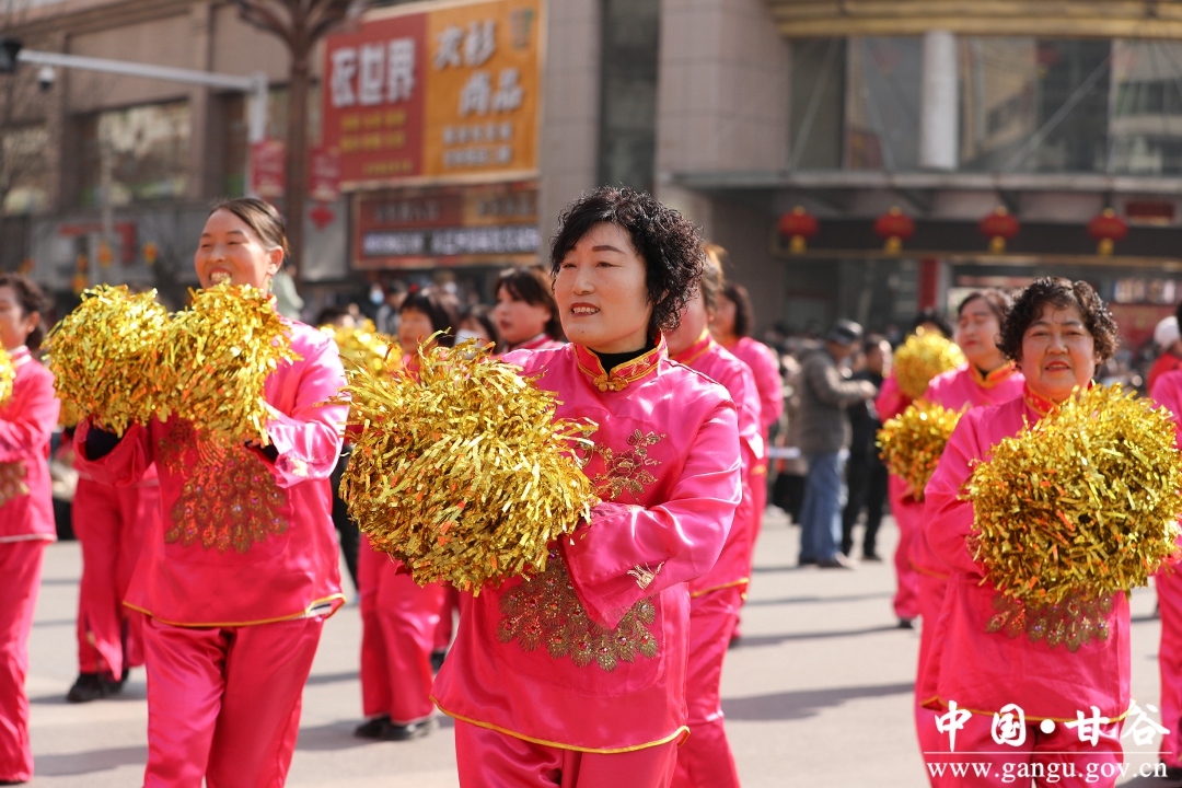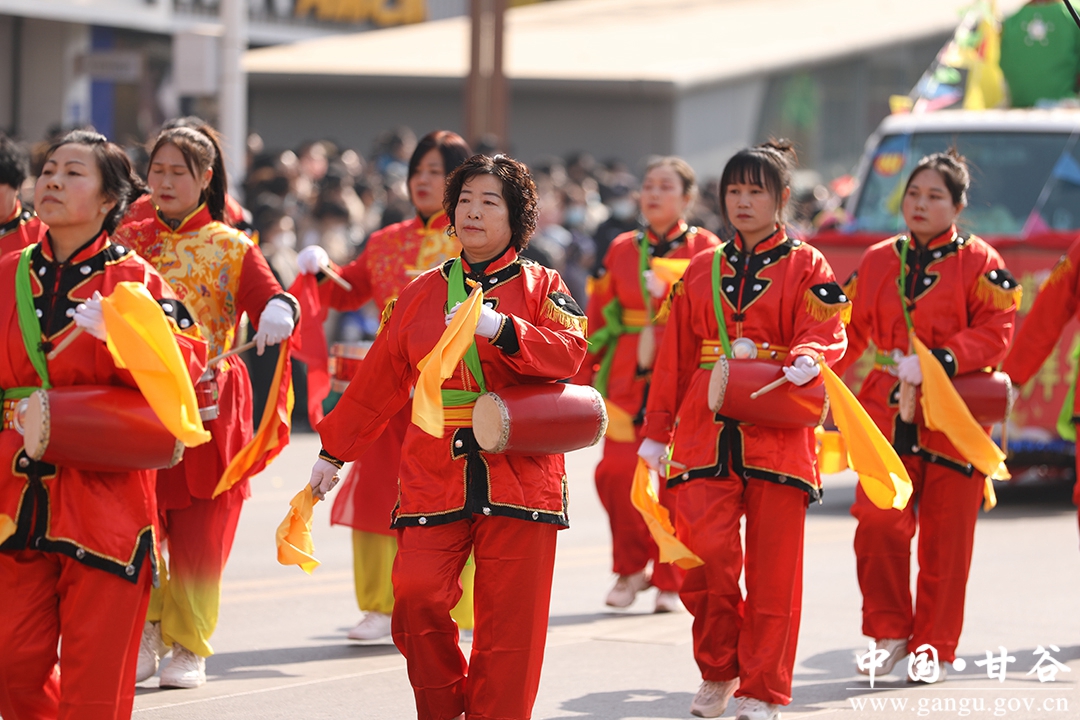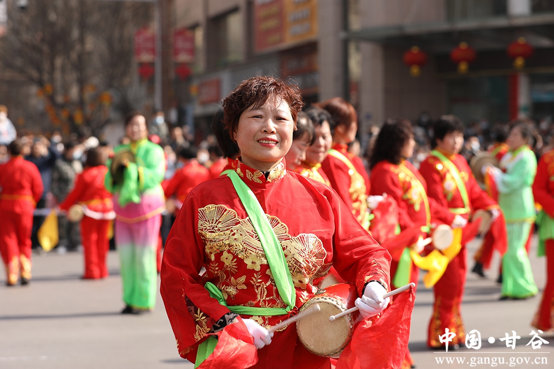 演员们个个喜笑颜开,身着华丽的服饰,精神抖擞、神采飞扬,随着喜庆的歌声舞动着身躯,排踩着欢快的鼓点相继亮相。大气磅礴的太平鼓、辗转腾挪的舞狮、独具特色的旱船、风趣诙谐的舞蹈、花团锦簇的彩车轮番上演,闹红了甘谷的正月天,也闹出了一个多姿多彩、有声有色的新春佳节。