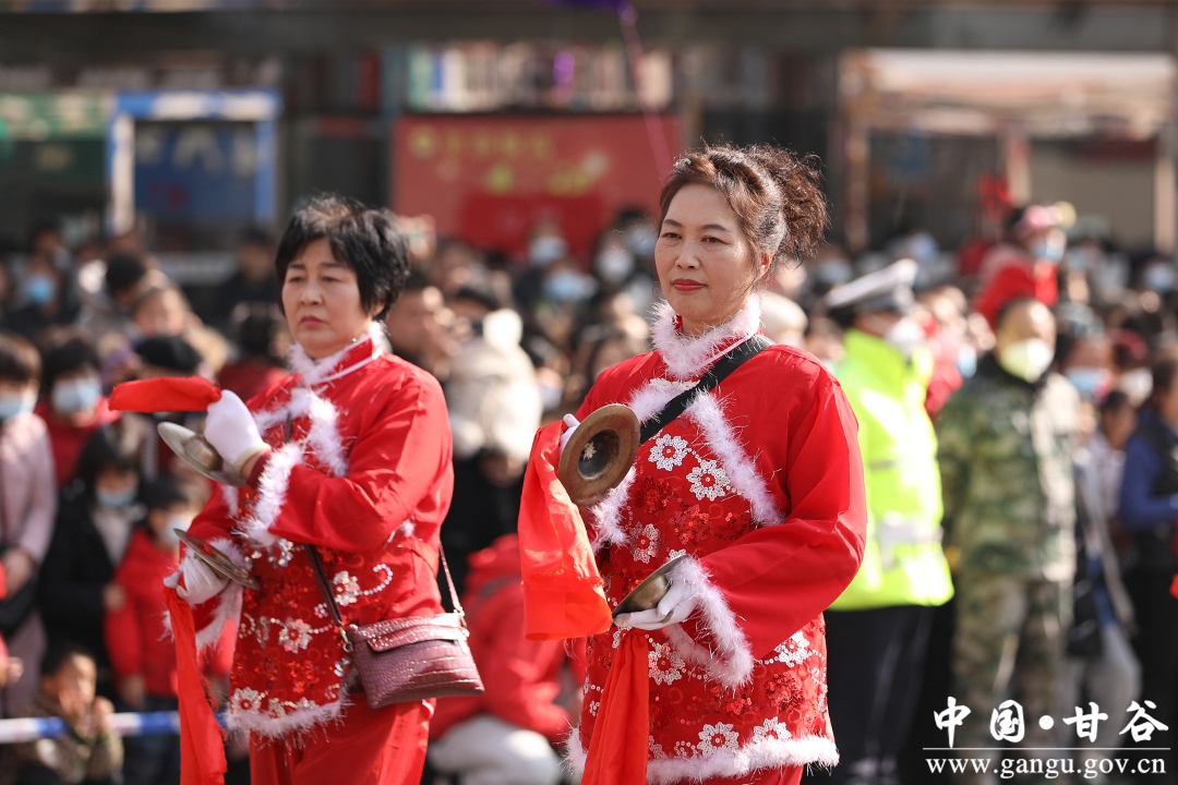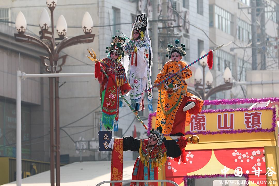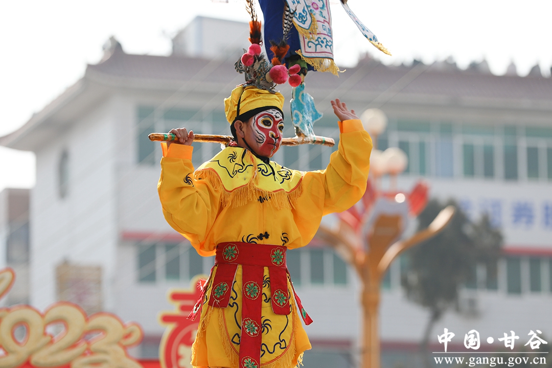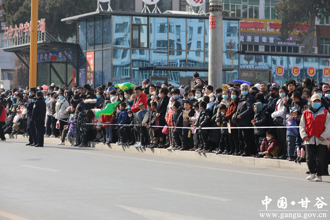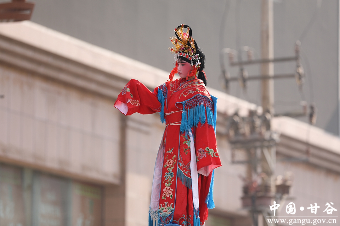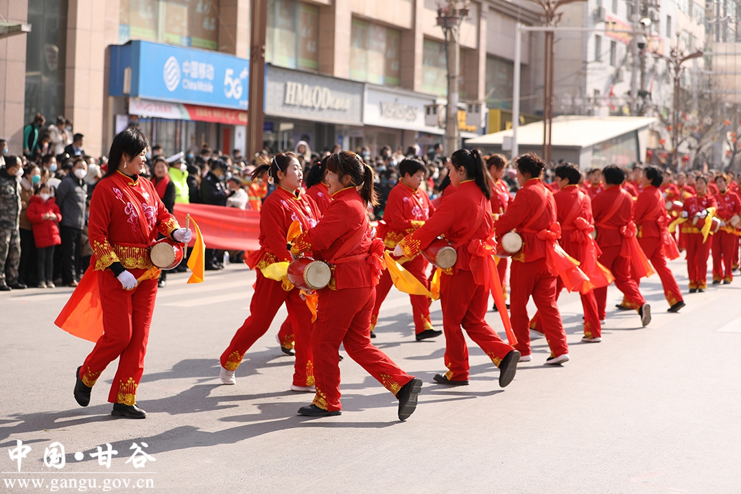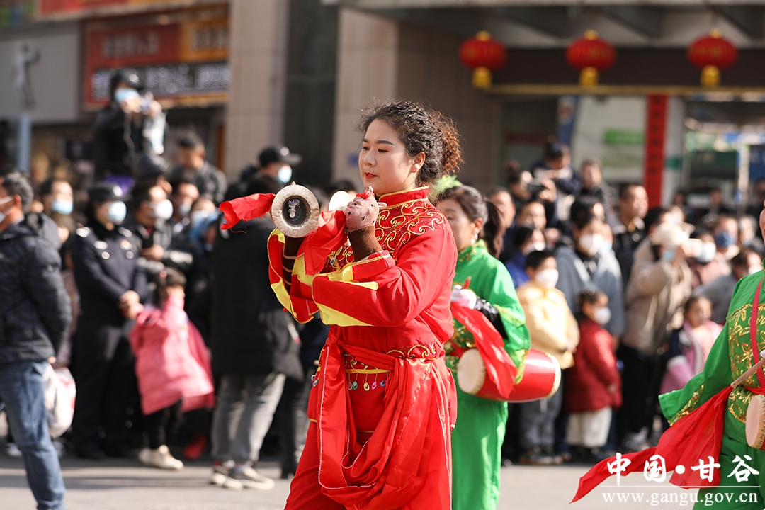 演员们个个喜笑颜开,身着华丽的服饰,精神抖擞、神采飞扬,随着喜庆的歌声舞动着身躯,排踩着欢快的鼓点相继亮相。大气磅礴的太平鼓、辗转腾挪的舞狮、独具特色的旱船、风趣诙谐的舞蹈、花团锦簇的彩车轮番上演,闹红了甘谷的正月天,也闹出了一个多姿多彩、有声有色的新春佳节。