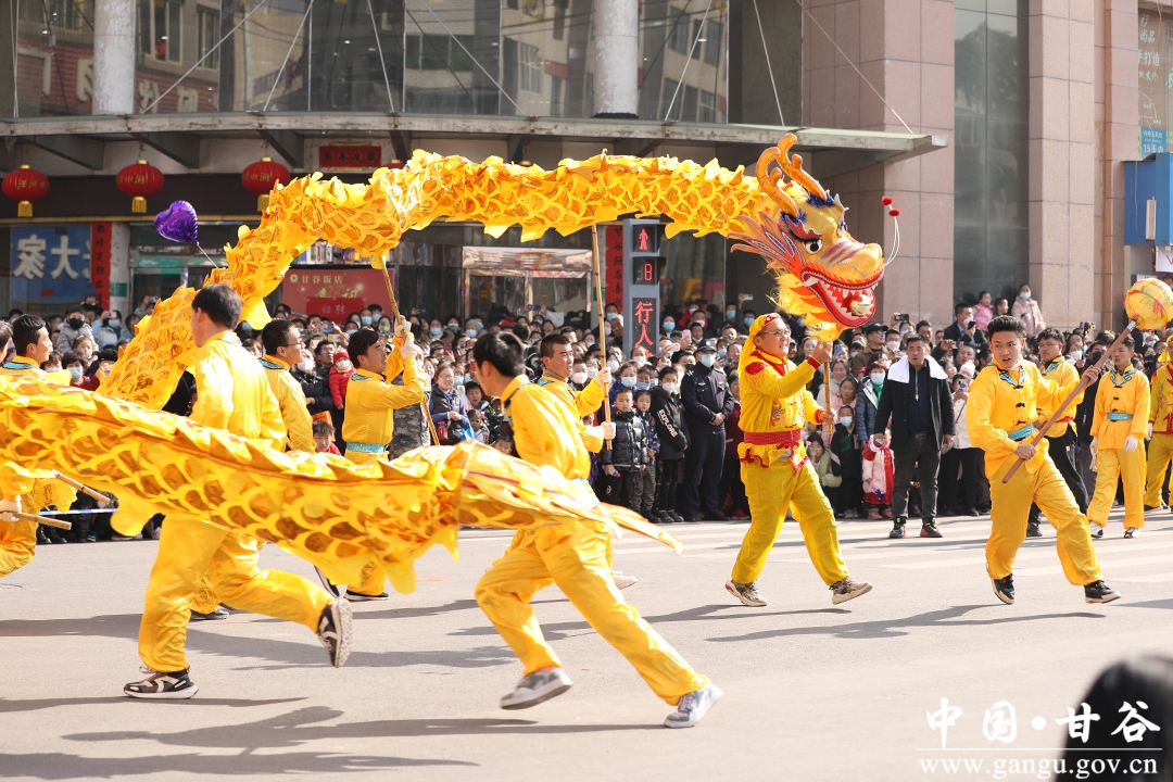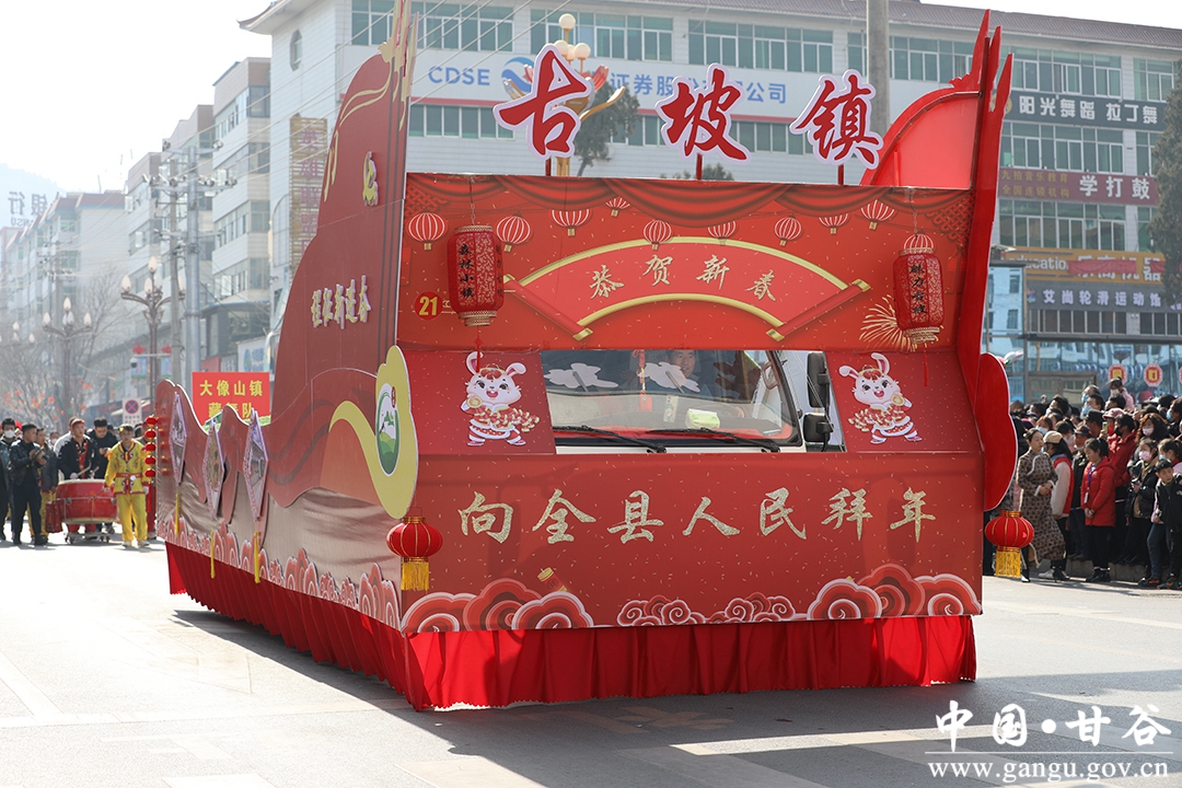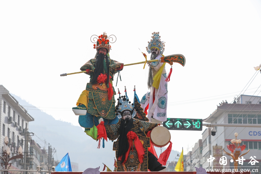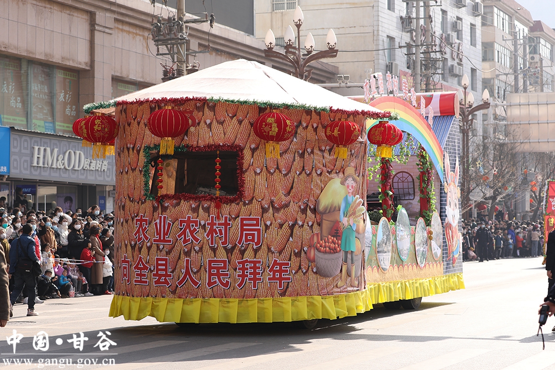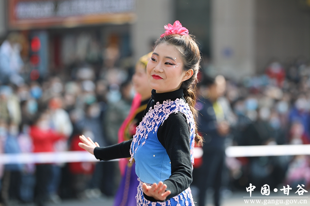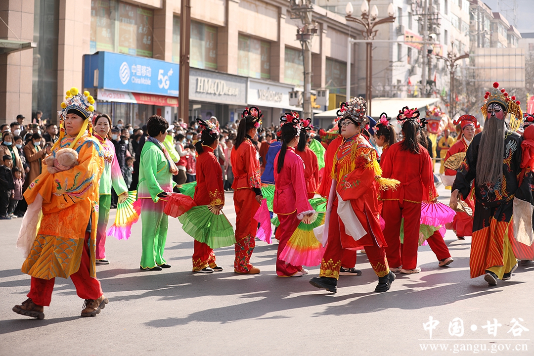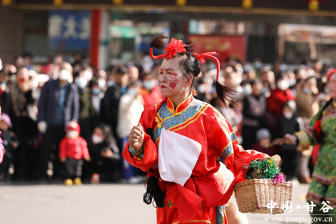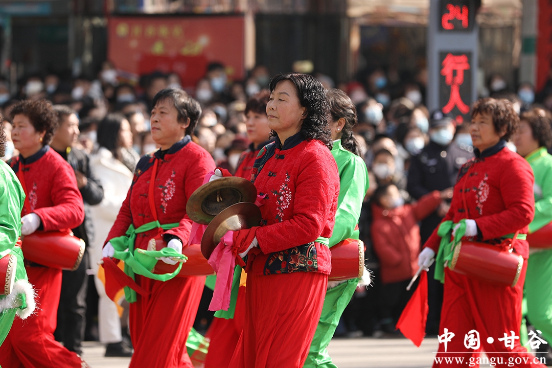 演员们个个喜笑颜开,身着华丽的服饰,精神抖擞、神采飞扬,随着喜庆的歌声舞动着身躯,排踩着欢快的鼓点相继亮相。大气磅礴的太平鼓、辗转腾挪的舞狮、独具特色的旱船、风趣诙谐的舞蹈、花团锦簇的彩车轮番上演,闹红了甘谷的正月天,也闹出了一个多姿多彩、有声有色的新春佳节。