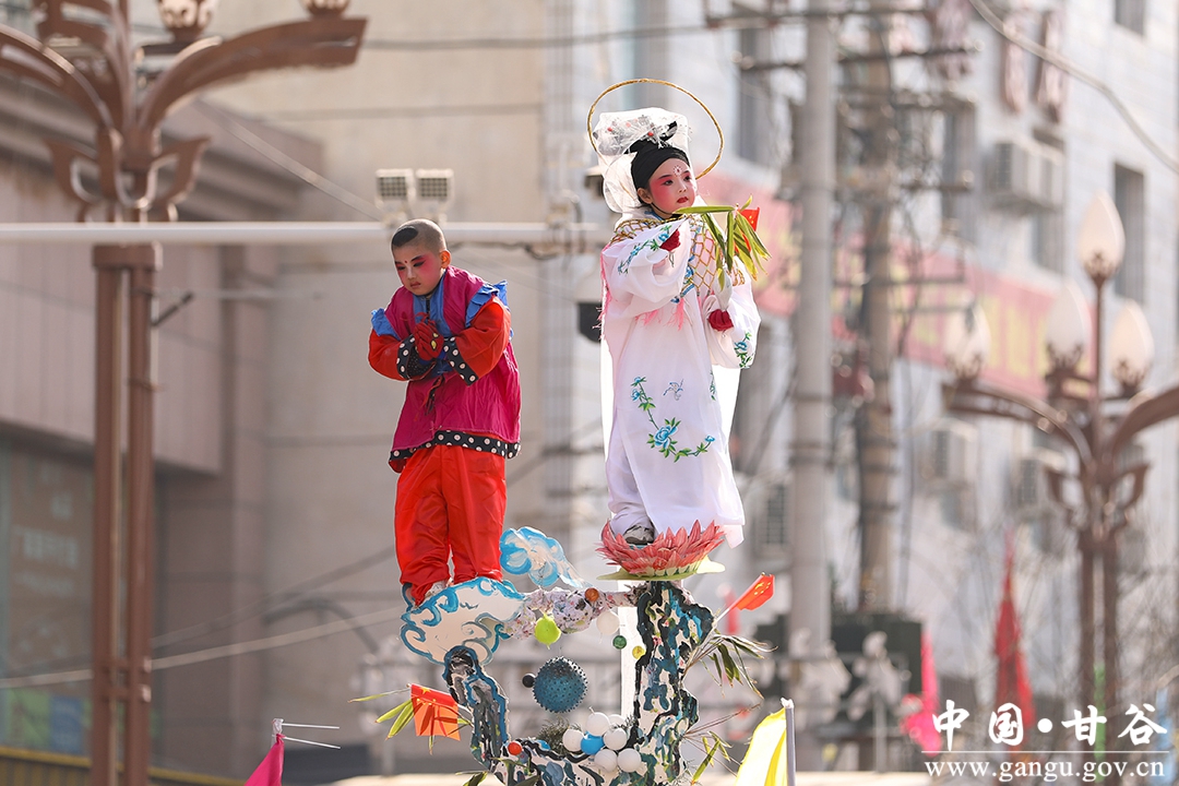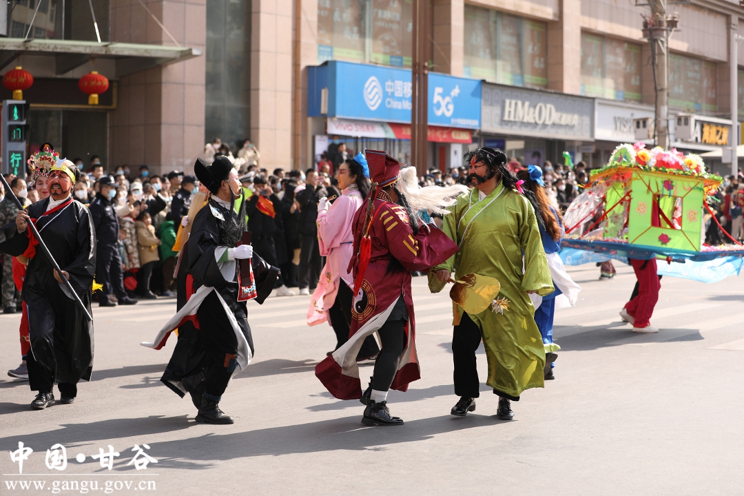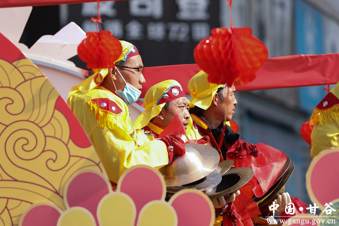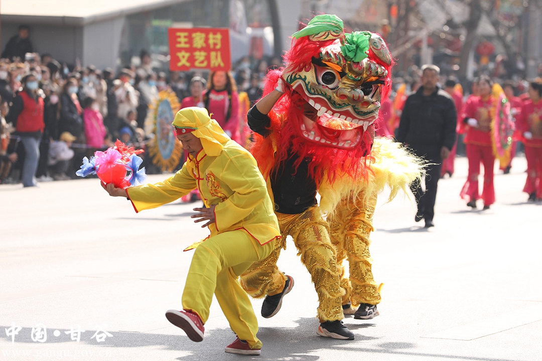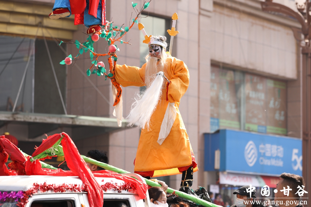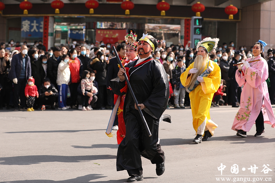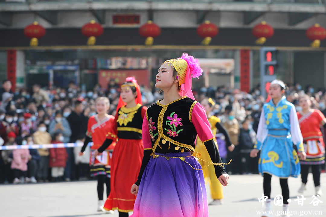 演员们个个喜笑颜开,身着华丽的服饰,精神抖擞、神采飞扬,随着喜庆的歌声舞动着身躯,排踩着欢快的鼓点相继亮相。大气磅礴的太平鼓、辗转腾挪的舞狮、独具特色的旱船、风趣诙谐的舞蹈、花团锦簇的彩车轮番上演,闹红了甘谷的正月天,也闹出了一个多姿多彩、有声有色的新春佳节。