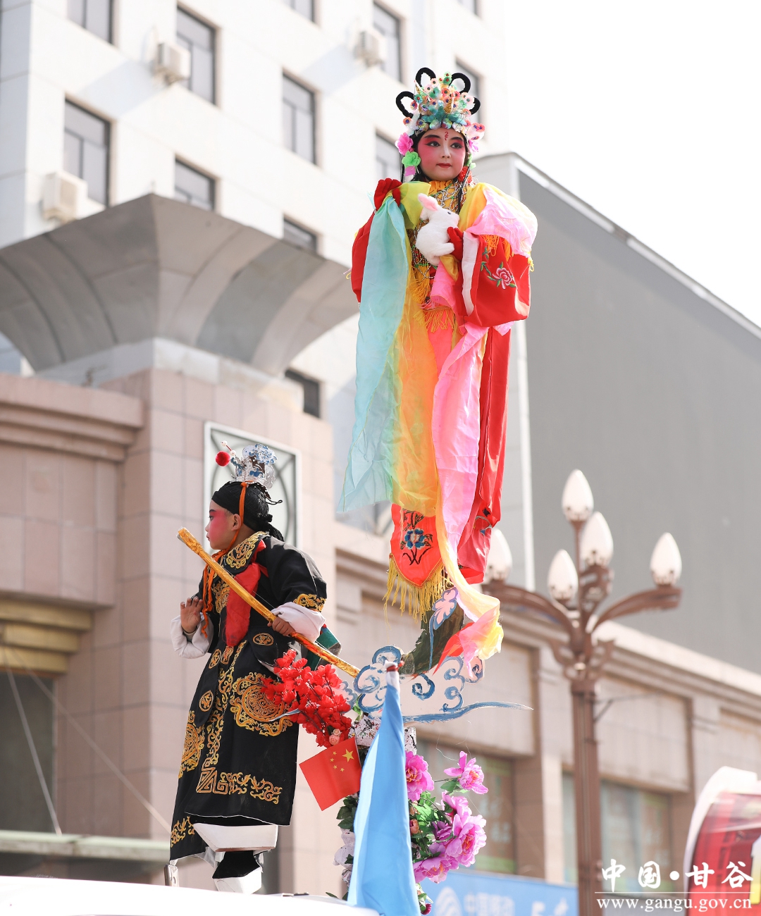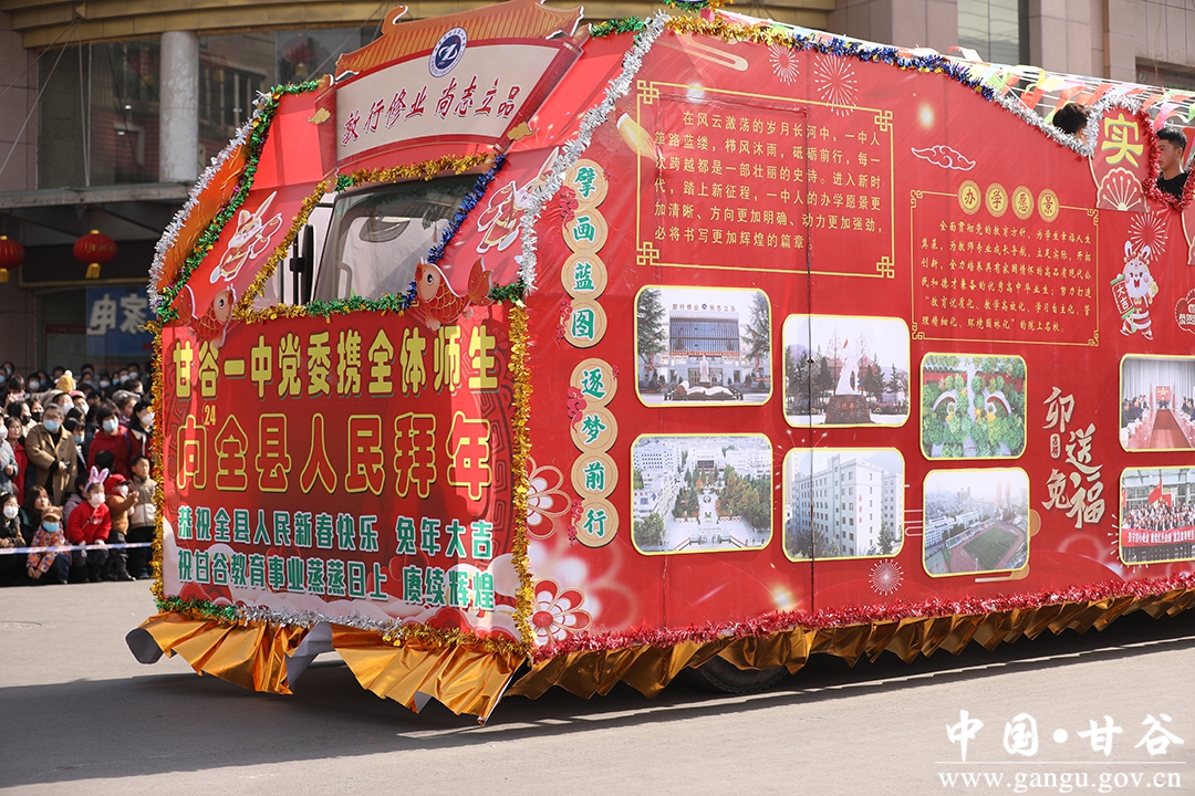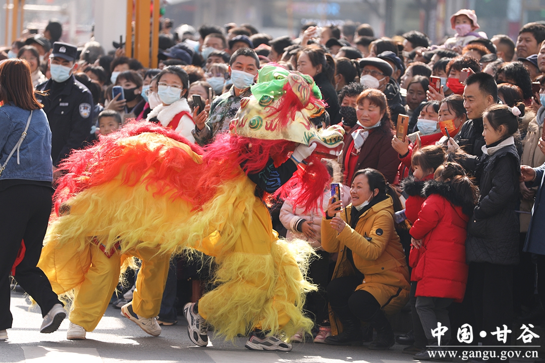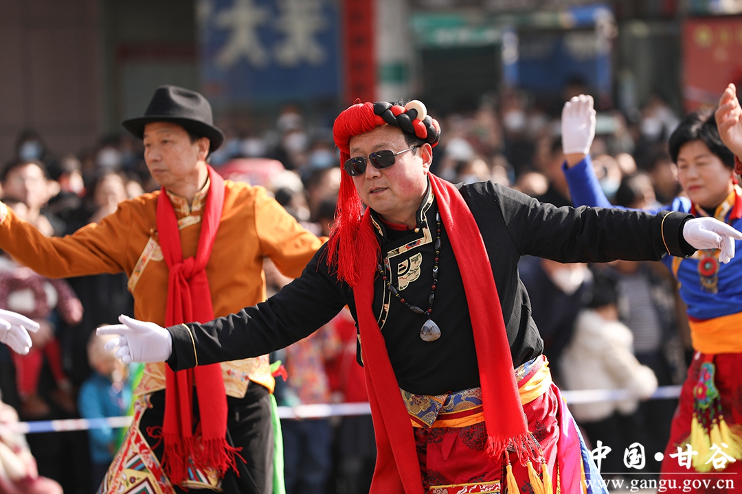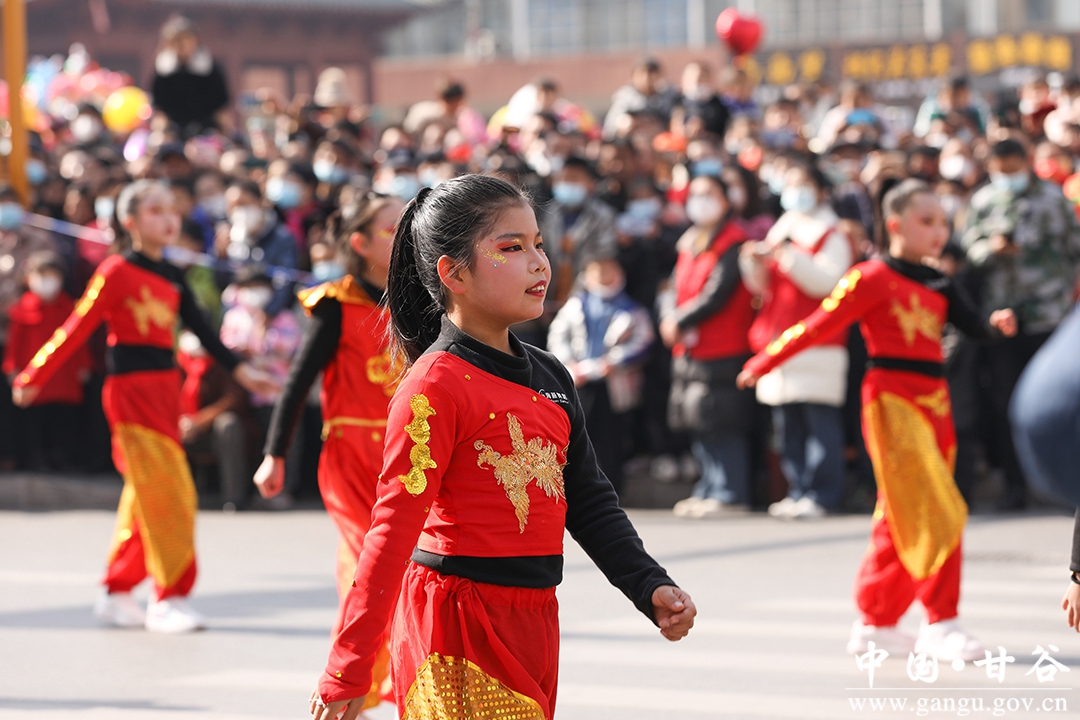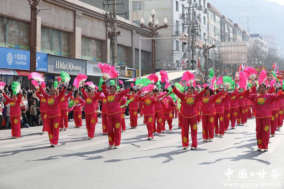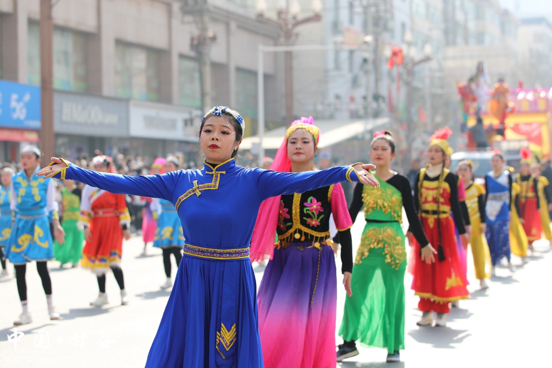演员们个个喜笑颜开,身着华丽的服饰,精神抖擞、神采飞扬,随着喜庆的歌声舞动着身躯,排踩着欢快的鼓点相继亮相。大气磅礴的太平鼓、辗转腾挪的舞狮、独具特色的旱船、风趣诙谐的舞蹈、花团锦簇的彩车轮番上演,闹红了甘谷的正月天,也闹出了一个多姿多彩、有声有色的新春佳节。