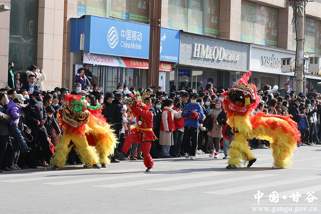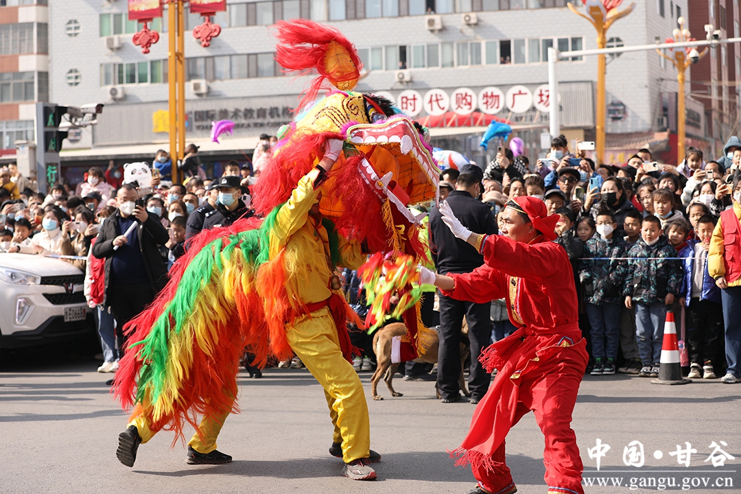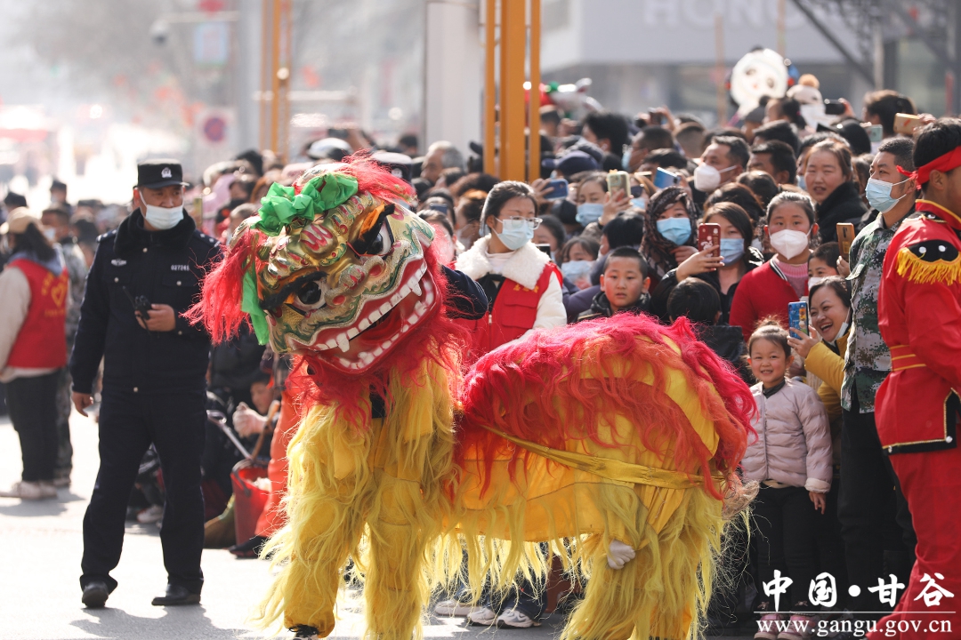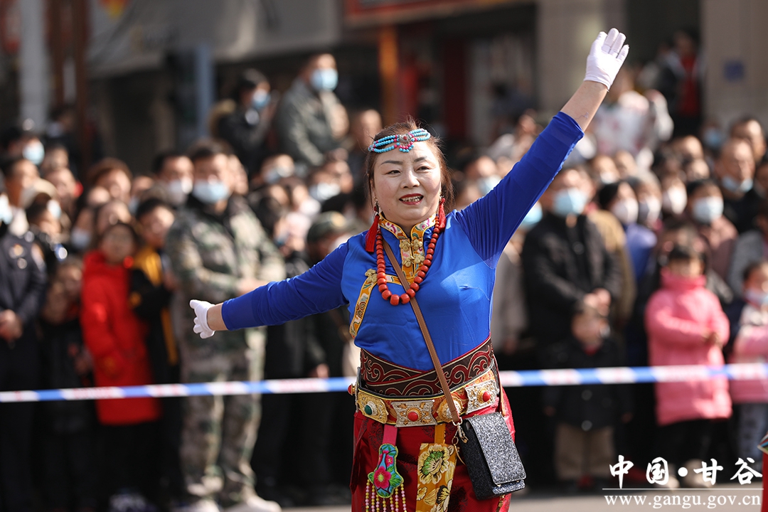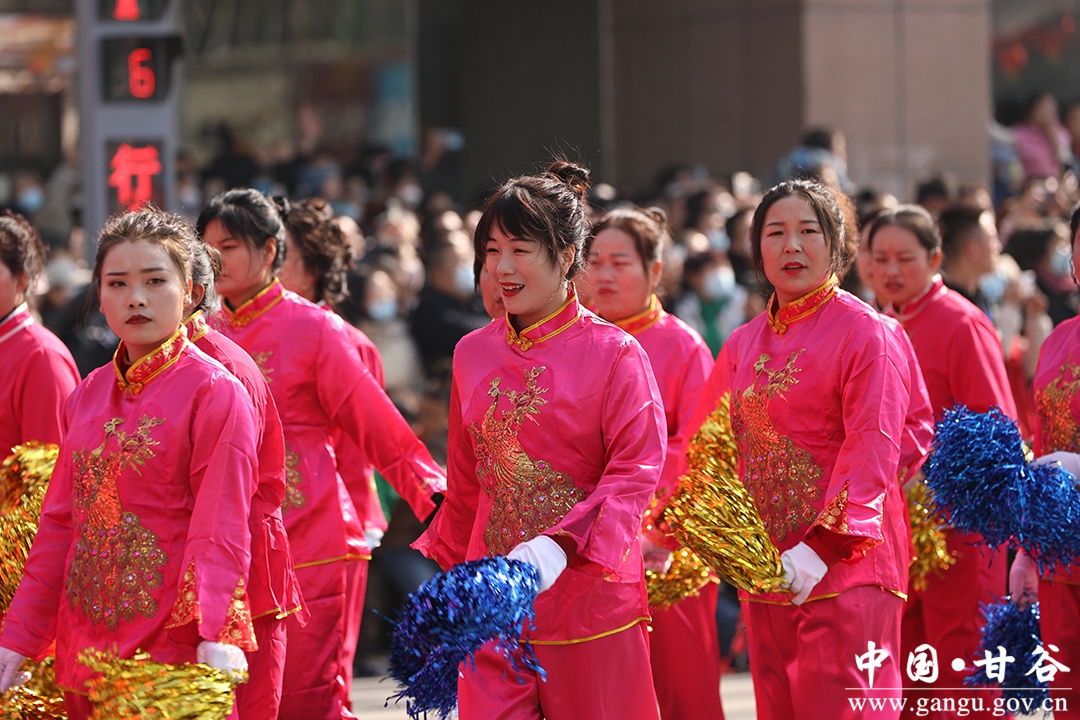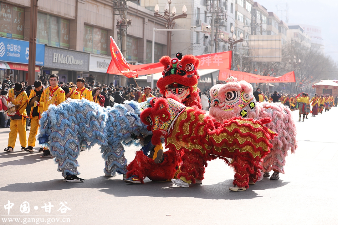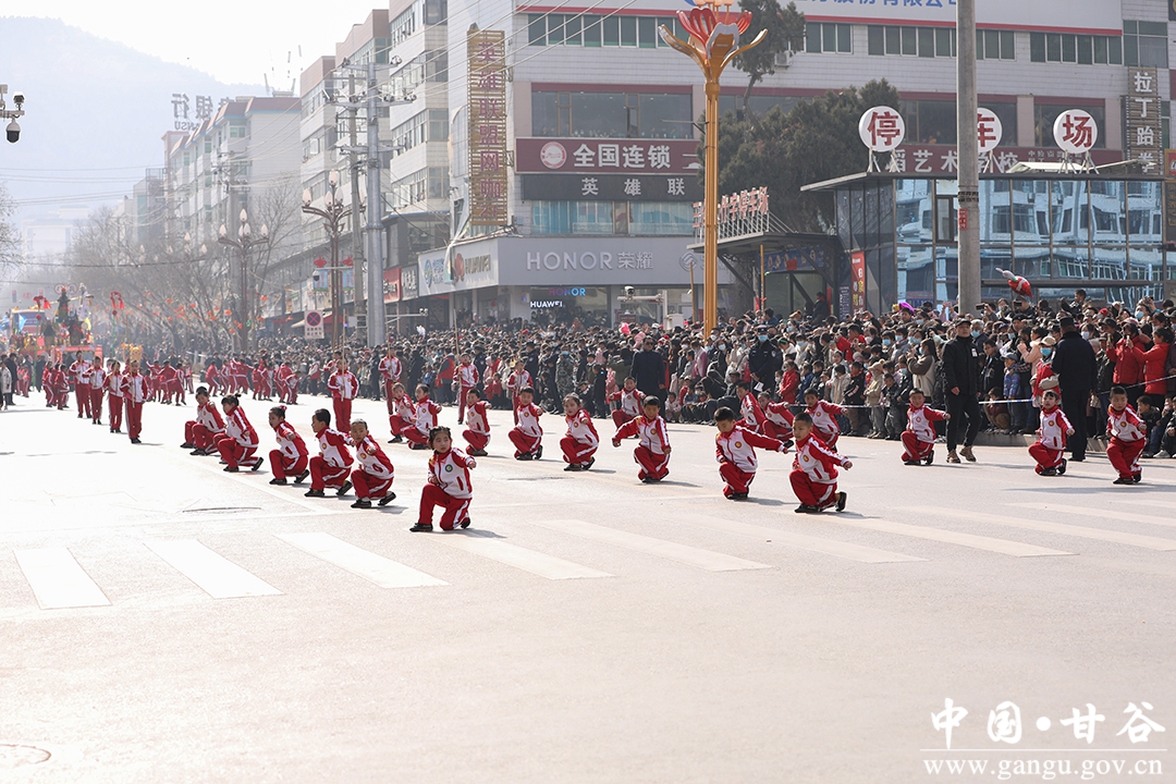 演员们个个喜笑颜开,身着华丽的服饰,精神抖擞、神采飞扬,随着喜庆的歌声舞动着身躯,排踩着欢快的鼓点相继亮相。大气磅礴的太平鼓、辗转腾挪的舞狮、独具特色的旱船、风趣诙谐的舞蹈、花团锦簇的彩车轮番上演,闹红了甘谷的正月天,也闹出了一个多姿多彩、有声有色的新春佳节。