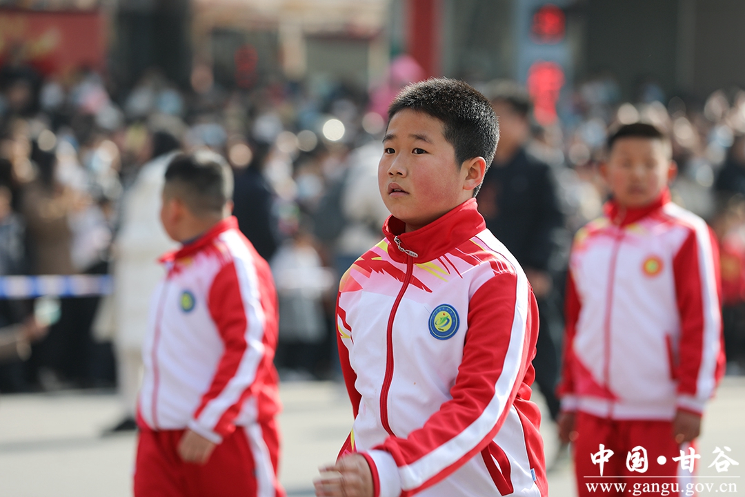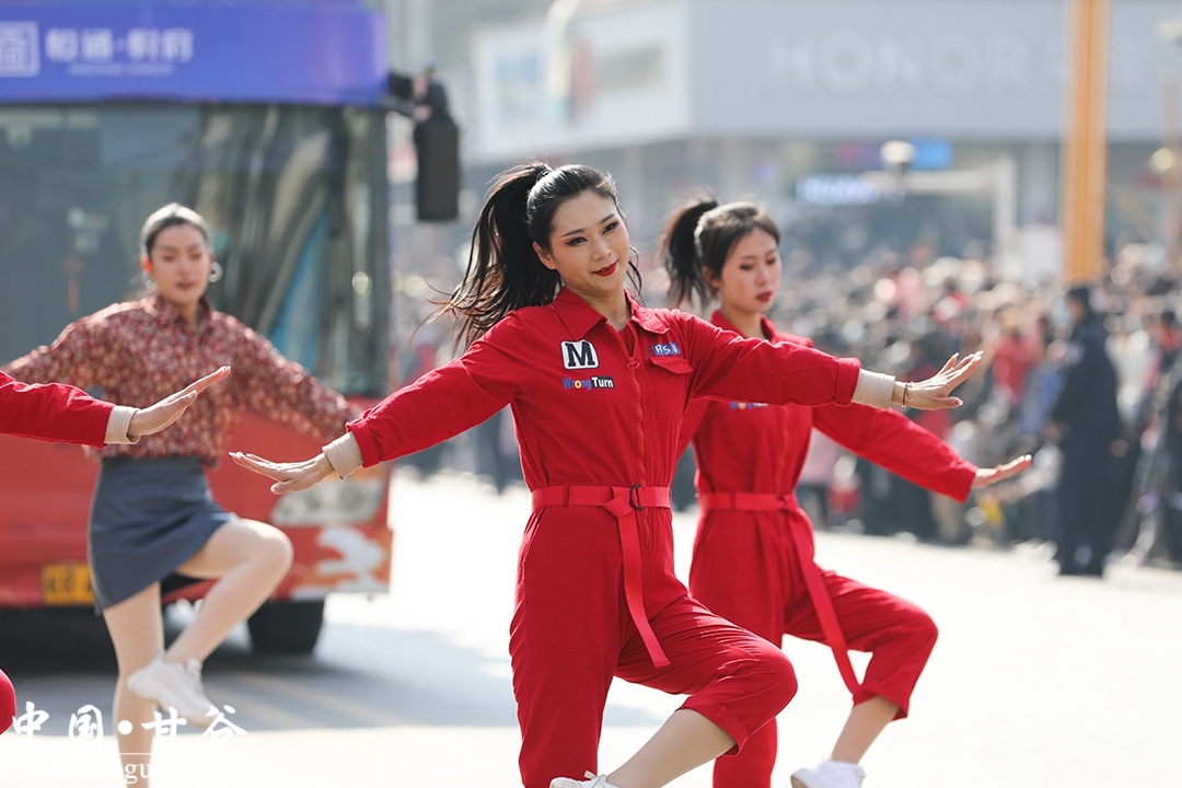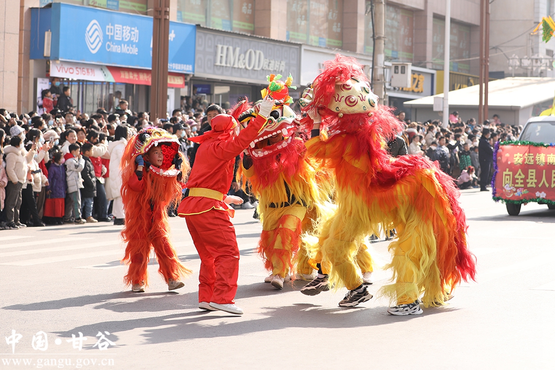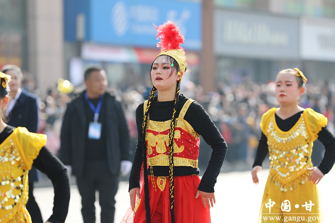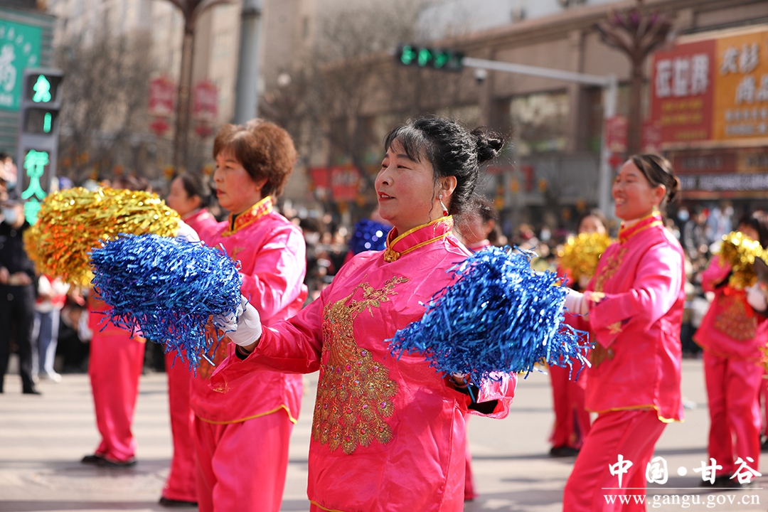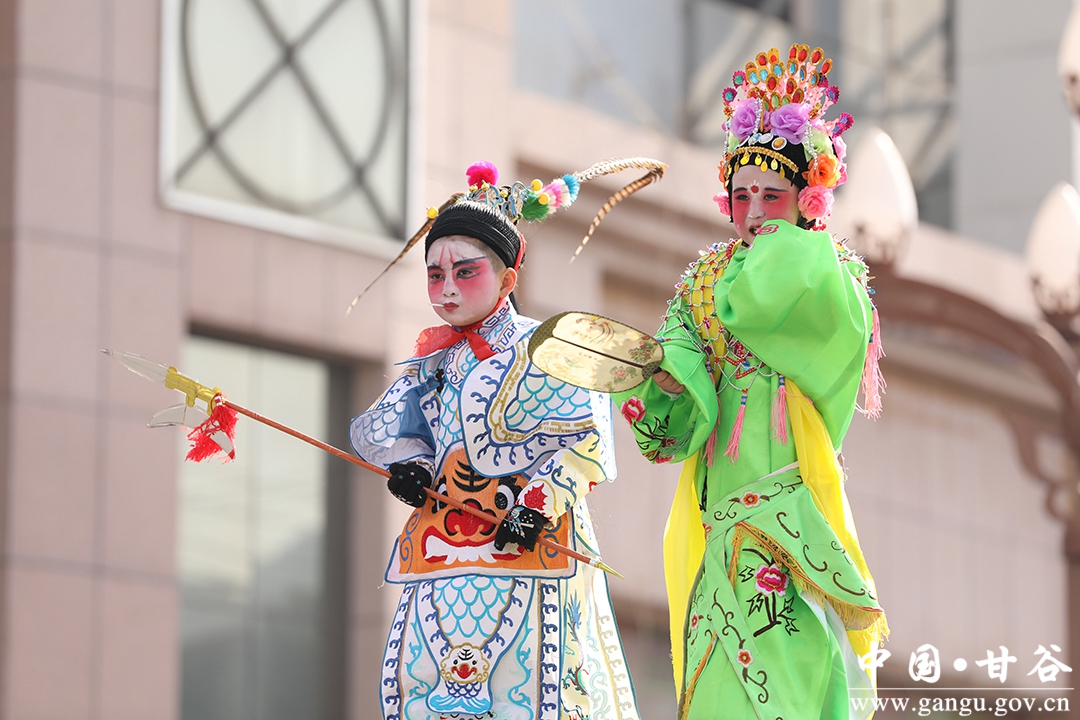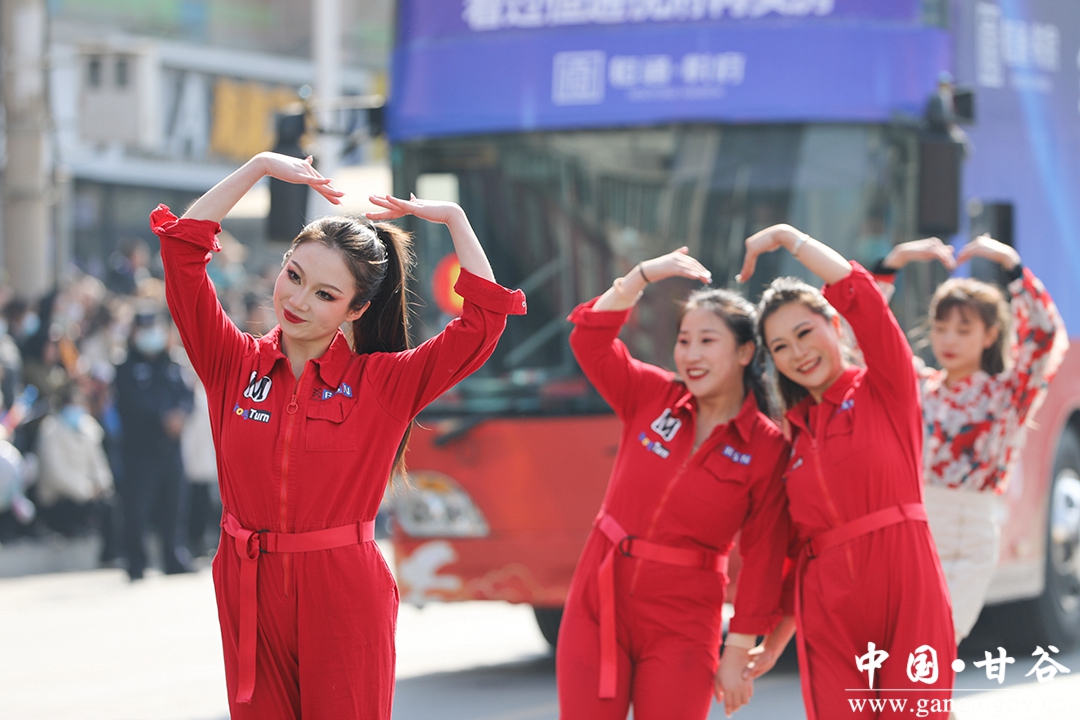 演员们个个喜笑颜开,身着华丽的服饰,精神抖擞、神采飞扬,随着喜庆的歌声舞动着身躯,排踩着欢快的鼓点相继亮相。大气磅礴的太平鼓、辗转腾挪的舞狮、独具特色的旱船、风趣诙谐的舞蹈、花团锦簇的彩车轮番上演,闹红了甘谷的正月天,也闹出了一个多姿多彩、有声有色的新春佳节。