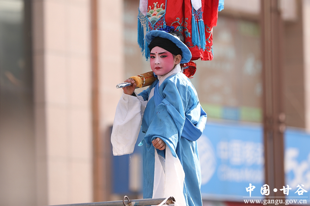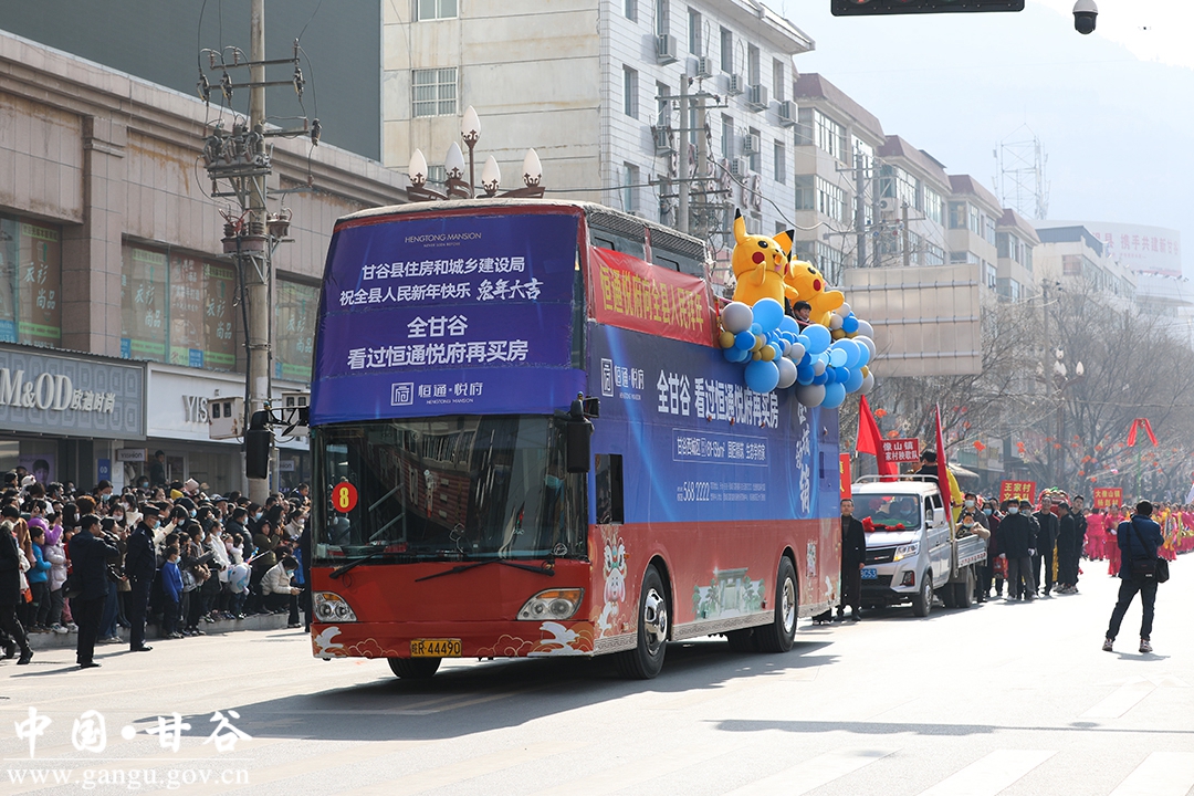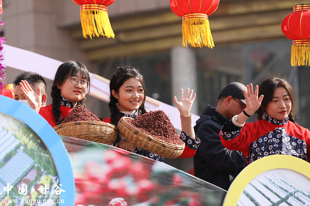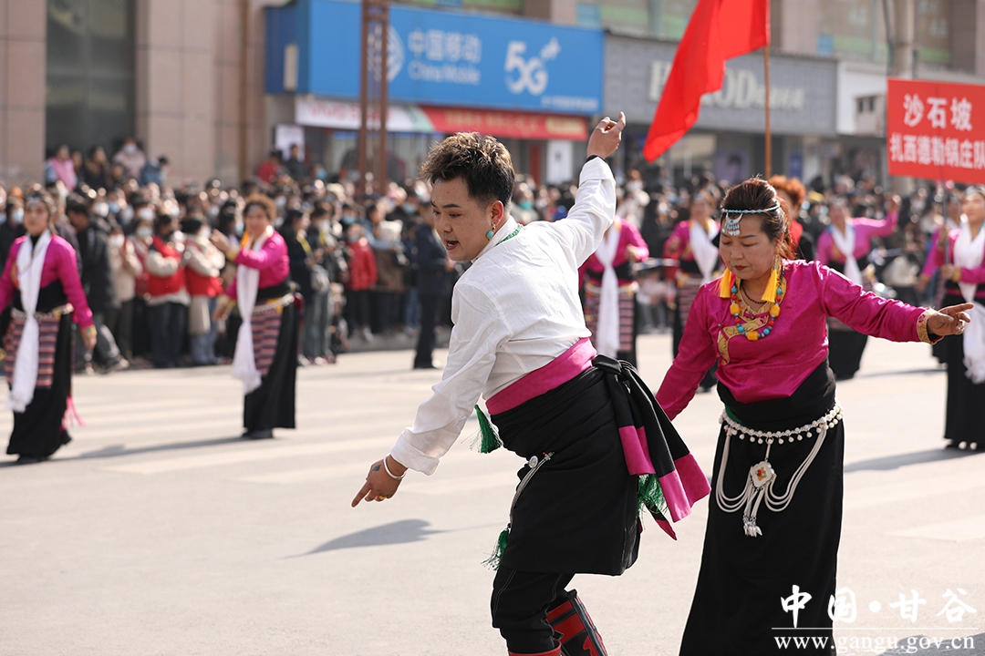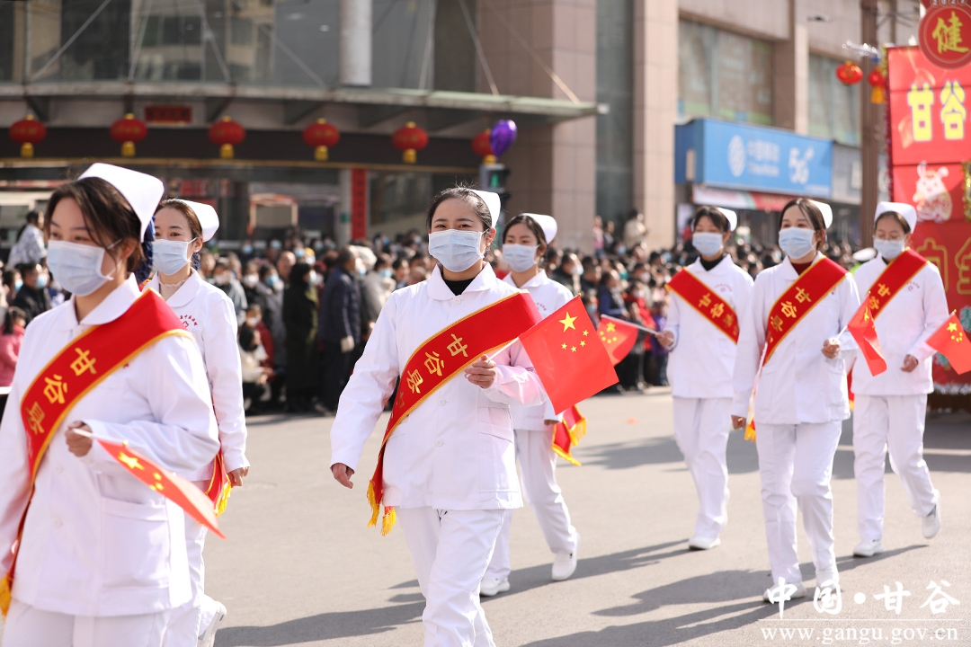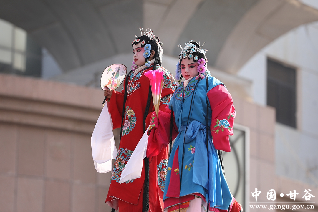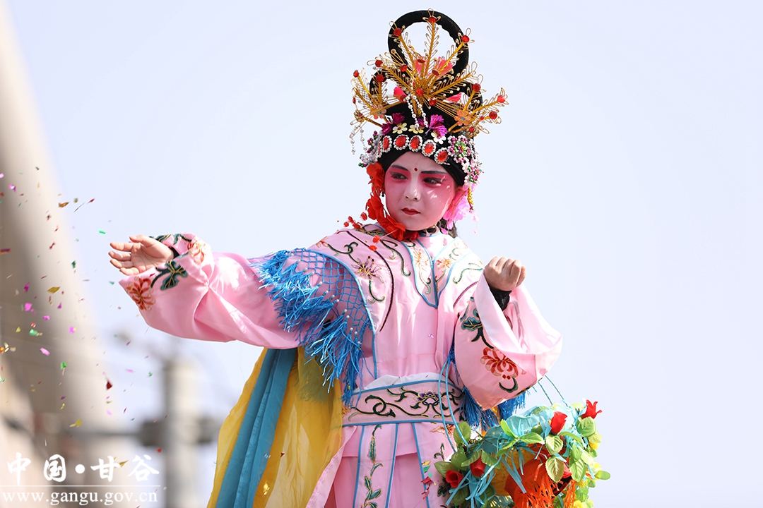 演员们个个喜笑颜开,身着华丽的服饰,精神抖擞、神采飞扬,随着喜庆的歌声舞动着身躯,排踩着欢快的鼓点相继亮相。大气磅礴的太平鼓、辗转腾挪的舞狮、独具特色的旱船、风趣诙谐的舞蹈、花团锦簇的彩车轮番上演,闹红了甘谷的正月天,也闹出了一个多姿多彩、有声有色的新春佳节。