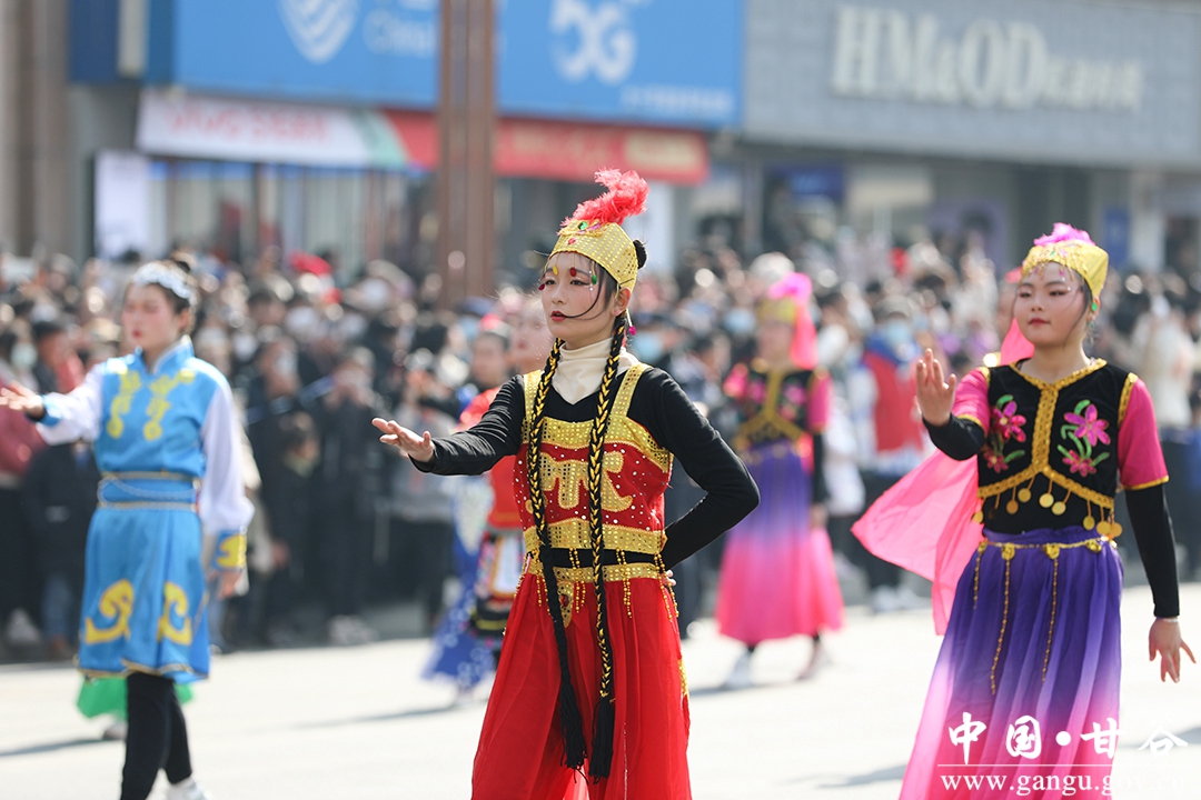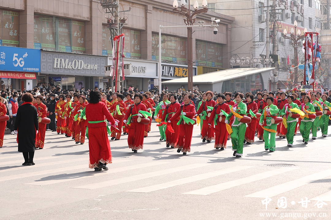 下午一时许,伴随着欢快喜庆的旋律,由乡镇、单位、企业组织的秧歌队从南关十字开始,自南向北沿新城路行进式表演了100多个丰富多彩的社火节目。