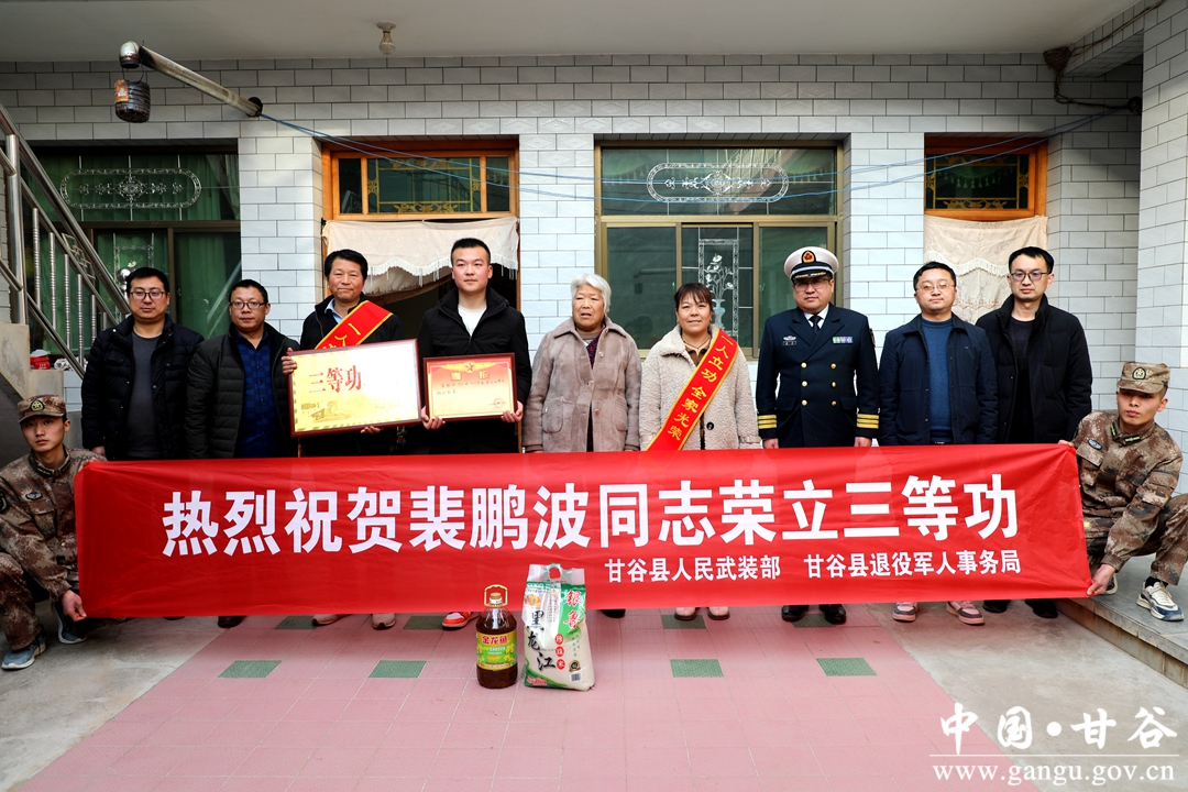 随后,杨磊和县退役军人事务局负责人一行,来到磐安镇裴家坪村为现役军人裴鹏波的家人送去了荣立三等功的喜报。