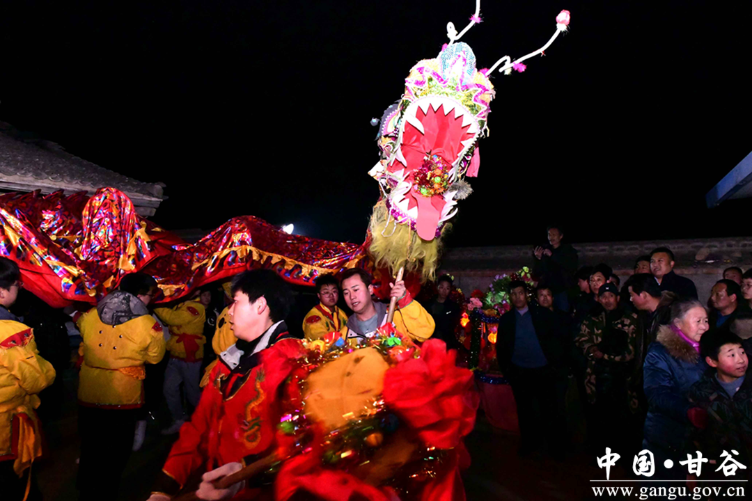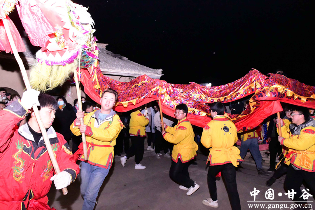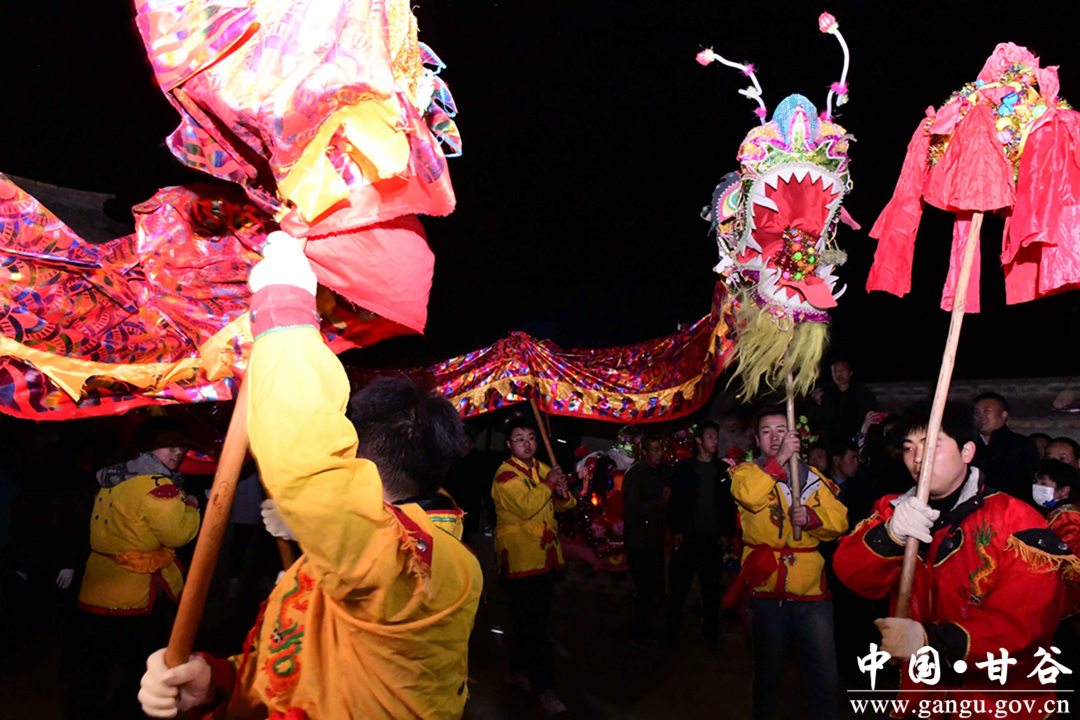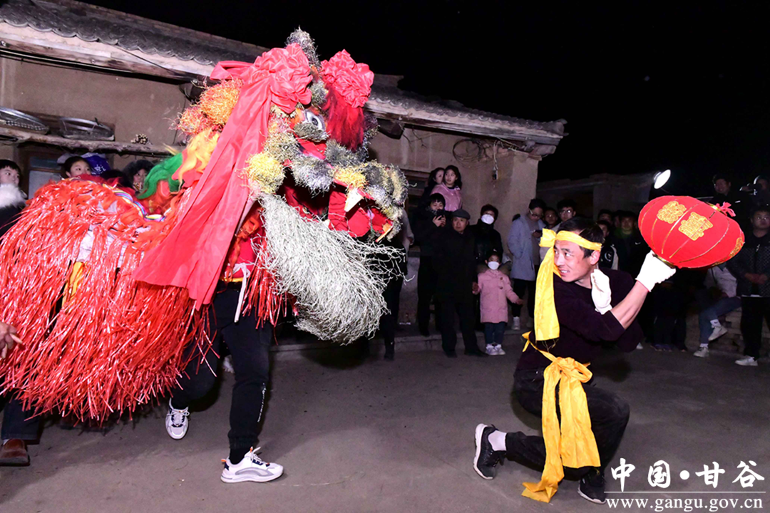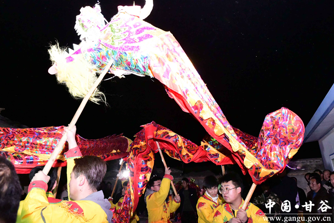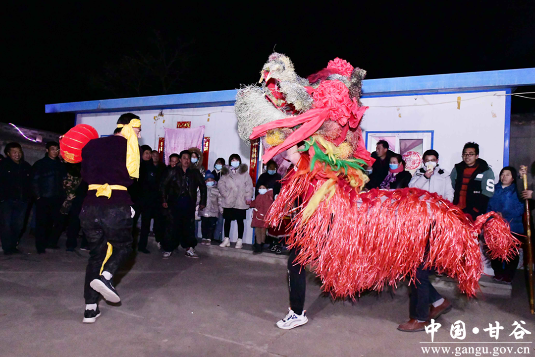 夜幕下的罗家屲人潮涌动、热闹非凡。鼓阵阵,舞翩翩,伴随着欢快的鼓点,所有队员舞起了社火扭起了秧歌,一条祥龙在队员们的卖力挥舞下翻腾飞跃,活灵活现的狮子在狮珠的引领下来回舞动,时而俯身游走,时而凌空腾跃,上演了“龙腾狮跃”的精彩一幕。