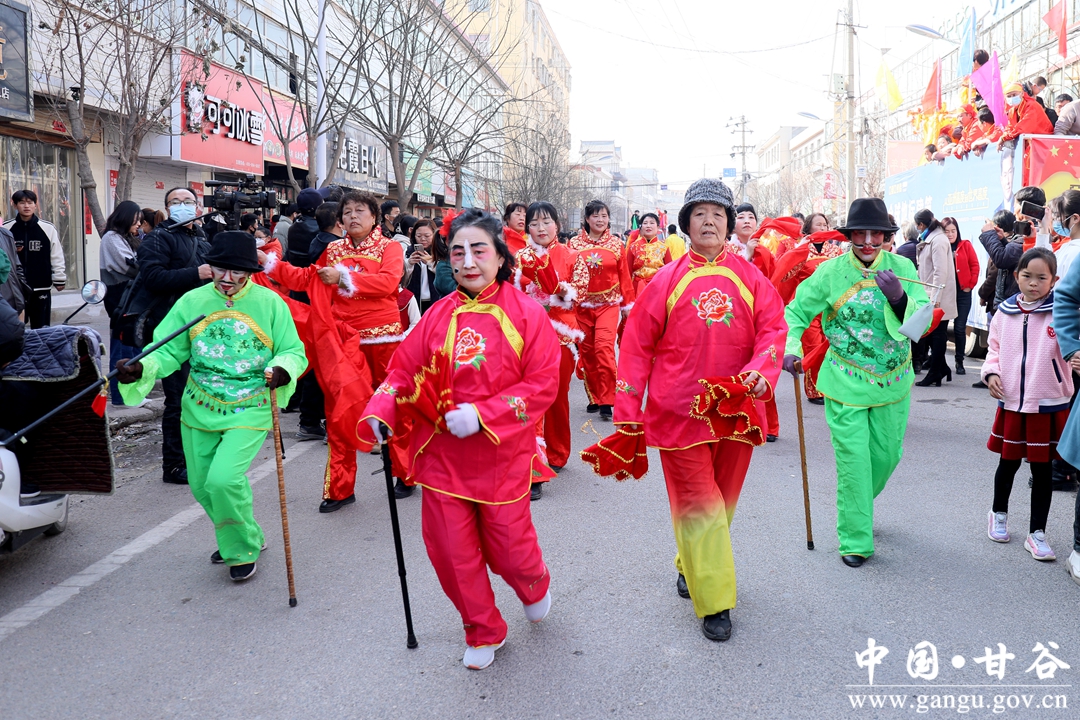 “咚咚咚锵,咚咚咚锵……”社火展演在锣鼓喧天的鼓点声中拉开了序幕,来自各村的社火展演代表迈着整齐的步伐,踏着喜庆的鼓点,和着欢快的节拍相继登场;腾跳起伏的舞狮,憨态可掬的旱船、跑驴,绚烂多姿的高台一一映入观众眼帘。