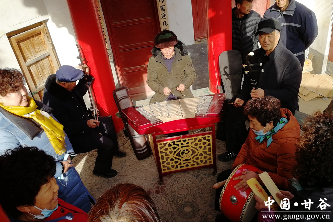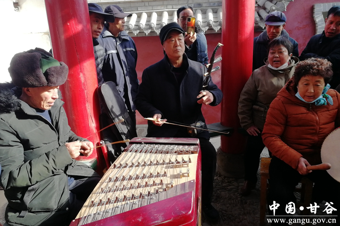 台下小曲子的爱好者还围在一起在二胡、杨琴、快板等乐器的伴奏下唱起了民俗小曲《哭周郎》、《天官赐福》、《状元游街》等甘谷小曲戏,用朴素的唱腔喜迎新春佳节。