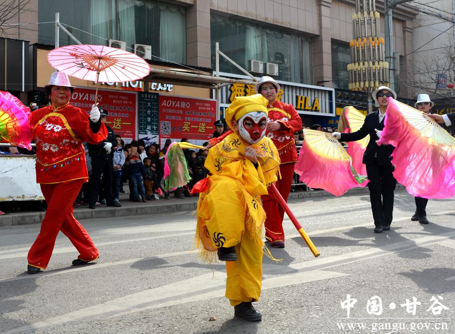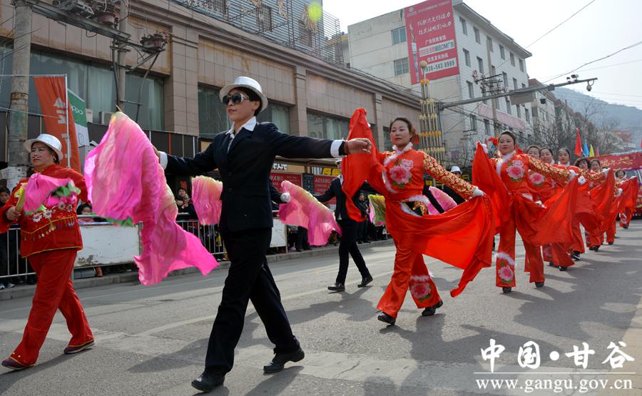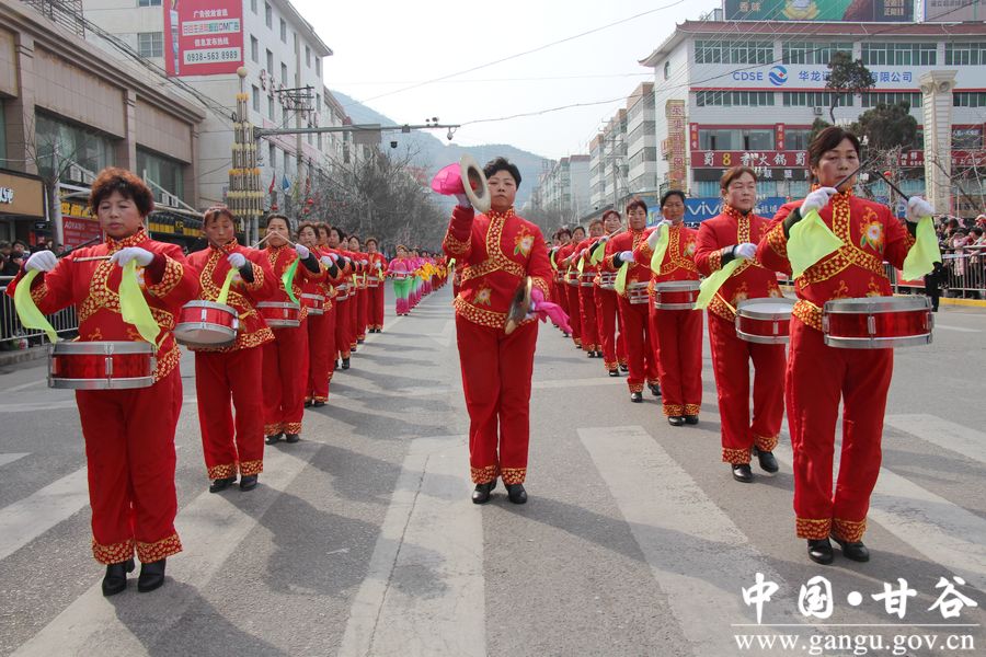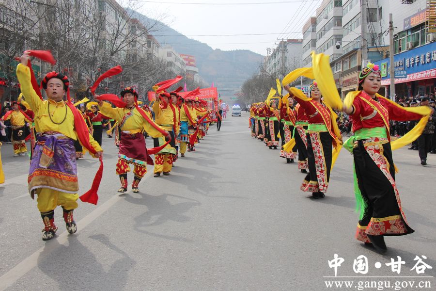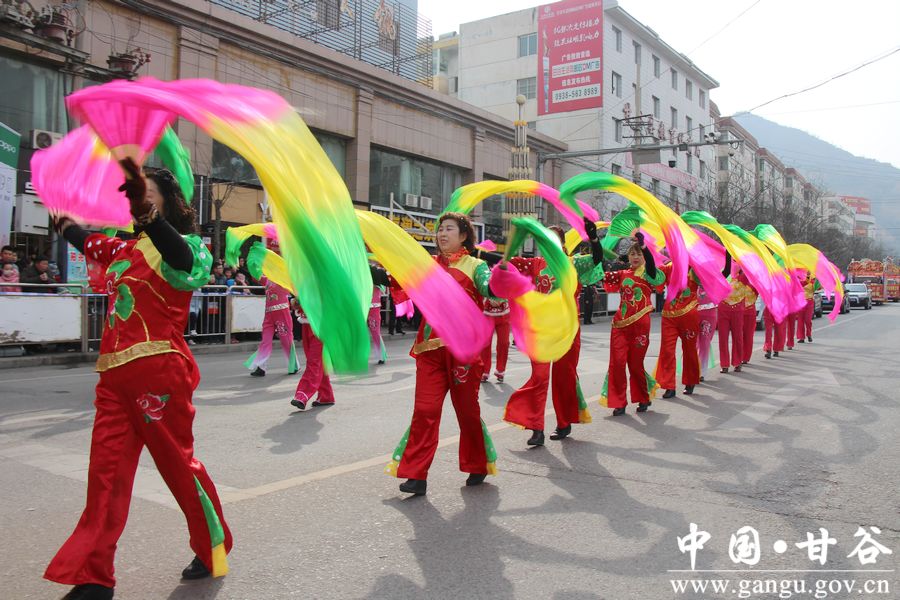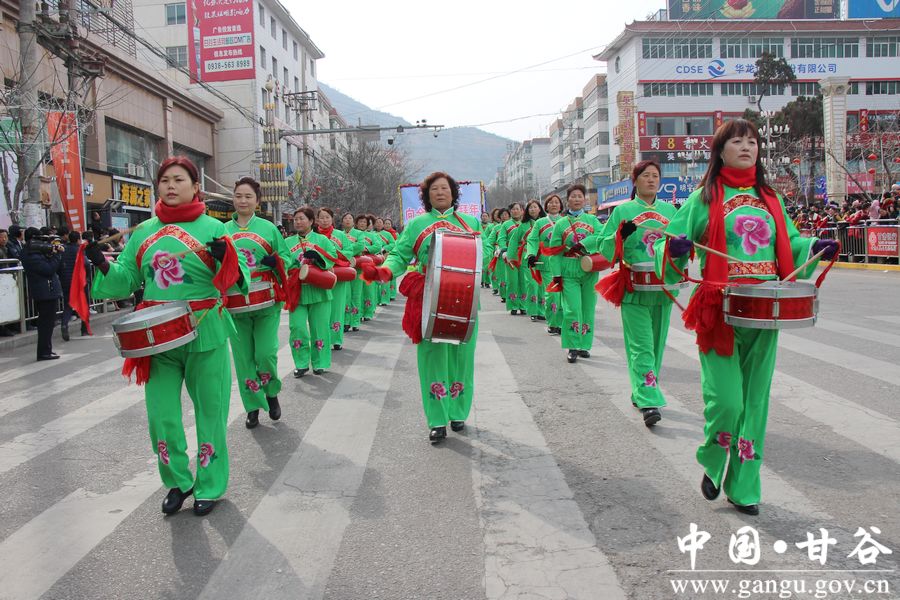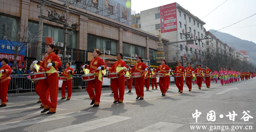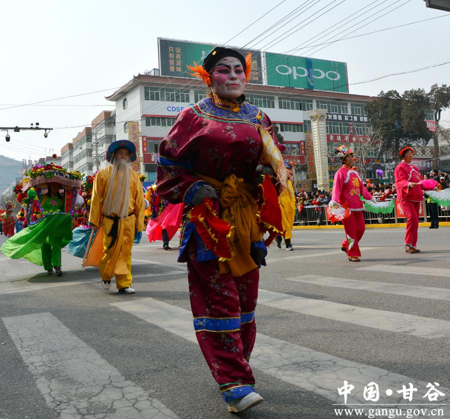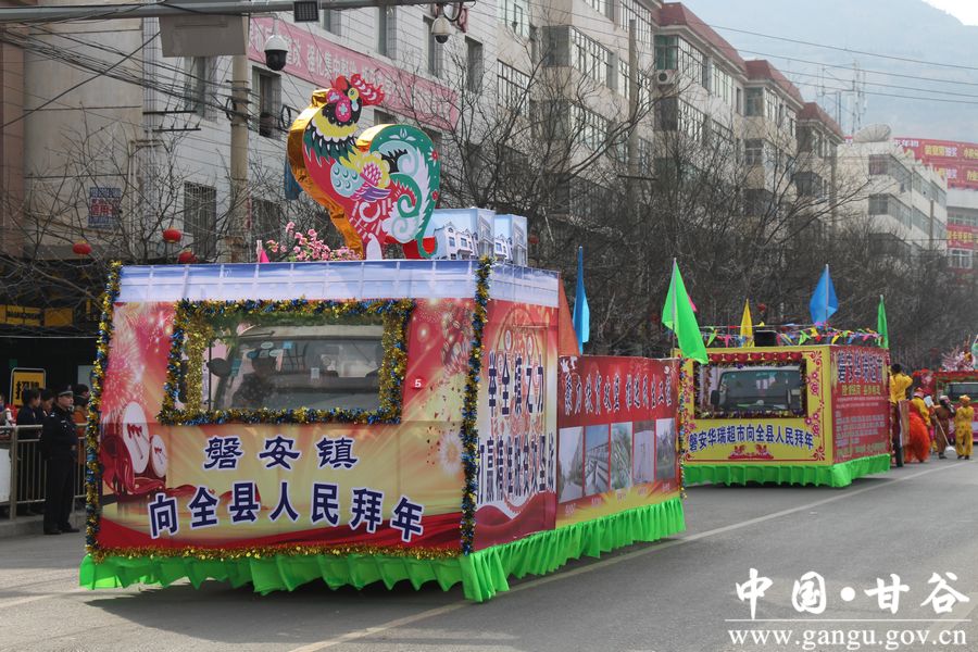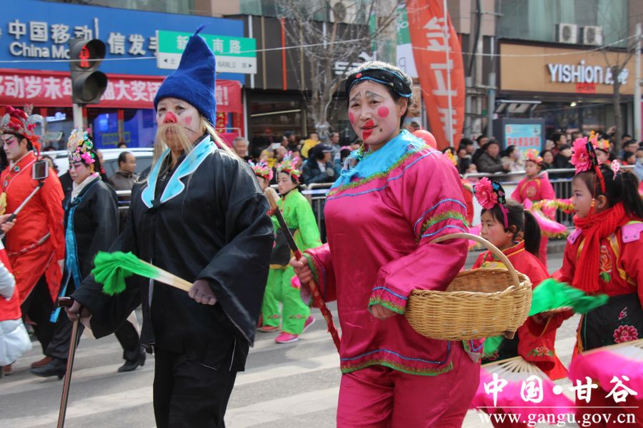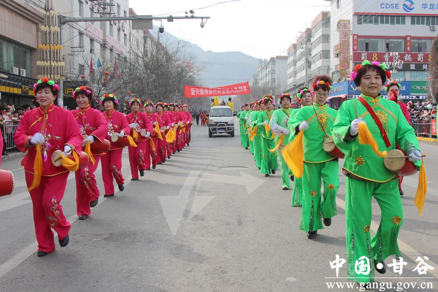 伴随着欢快喜庆的旋律,由乡镇、单位、企业组织的秧歌队从南关什字开始,自南向北沿新城路行进式表演了100多个丰富多彩的社火节目。狂奔跳跃的雄狮、腾空飞舞的长龙、独具特色的旱船、风趣幽默的舞蹈、花团锦簇的彩车、风格迥异的秦腔脸谱等地域特色鲜明、乡土气息浓厚的民俗文艺节目,集中展示了甘谷深厚的文化底蕴和特色文化建设丰硕成果,充分展现了甘谷人民喜庆盛世、共建和谐、共创辉煌的豪迈气概和昂扬向上的良好精神风貌,为鸡年春节增添了浓浓的节日气氛,给广大群众奉献了一场喜庆祥和、欢乐丰盛的文化大餐。