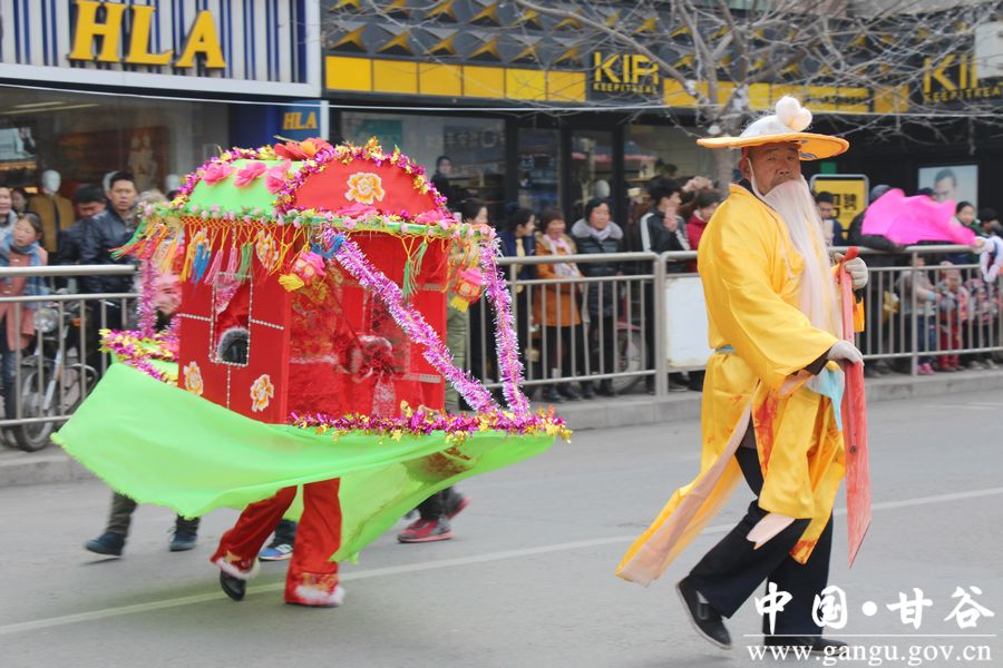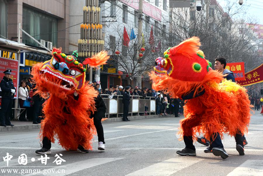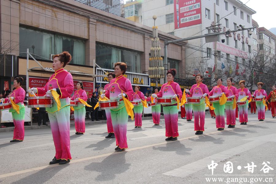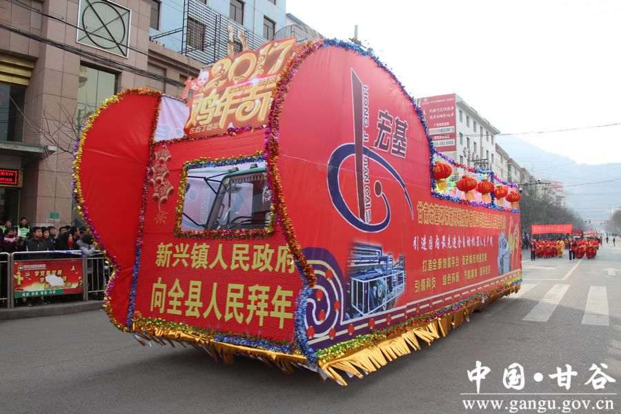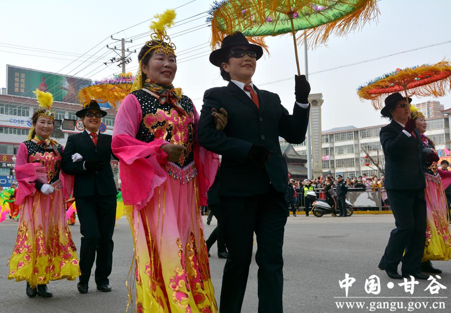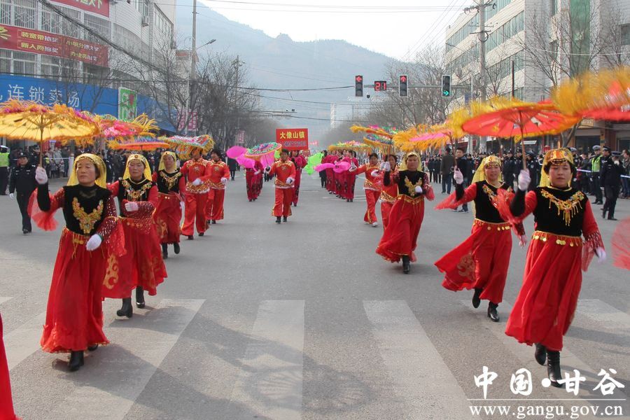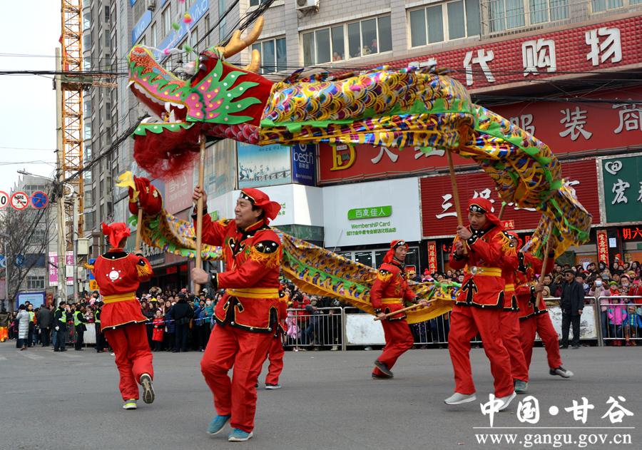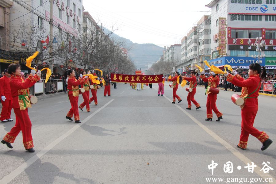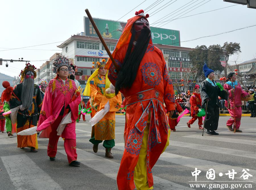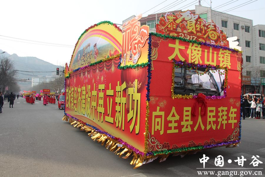 伴随着欢快喜庆的旋律,由乡镇、单位、企业组织的秧歌队从南关什字开始,自南向北沿新城路行进式表演了100多个丰富多彩的社火节目。狂奔跳跃的雄狮、腾空飞舞的长龙、独具特色的旱船、风趣幽默的舞蹈、花团锦簇的彩车、风格迥异的秦腔脸谱等地域特色鲜明、乡土气息浓厚的民俗文艺节目,集中展示了甘谷深厚的文化底蕴和特色文化建设丰硕成果,充分展现了甘谷人民喜庆盛世、共建和谐、共创辉煌的豪迈气概和昂扬向上的良好精神风貌,为鸡年春节增添了浓浓的节日气氛,给广大群众奉献了一场喜庆祥和、欢乐丰盛的文化大餐。