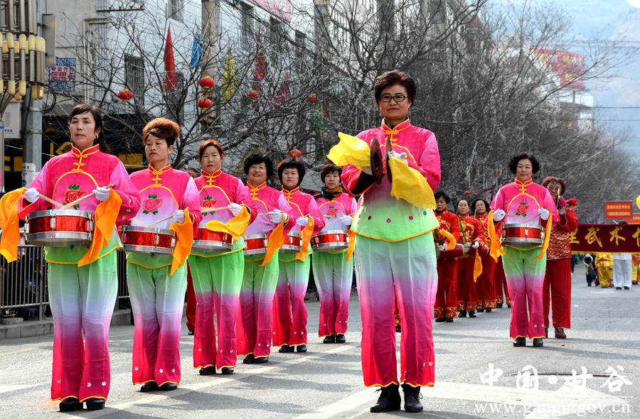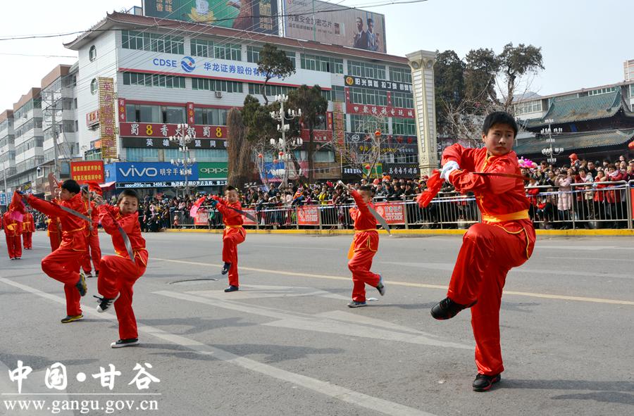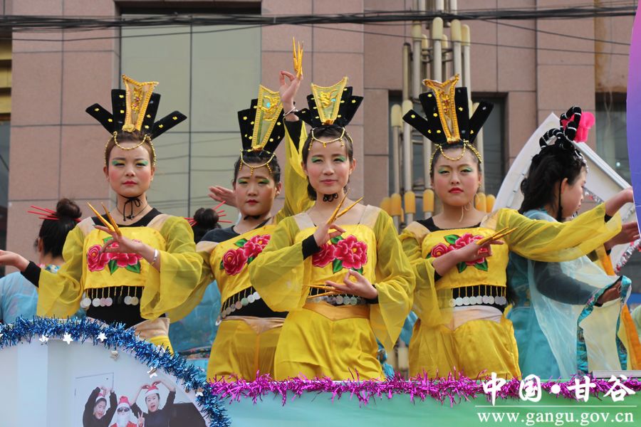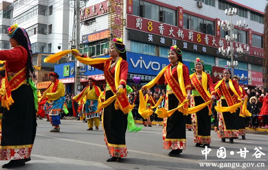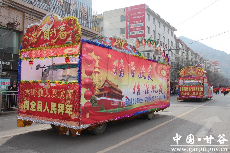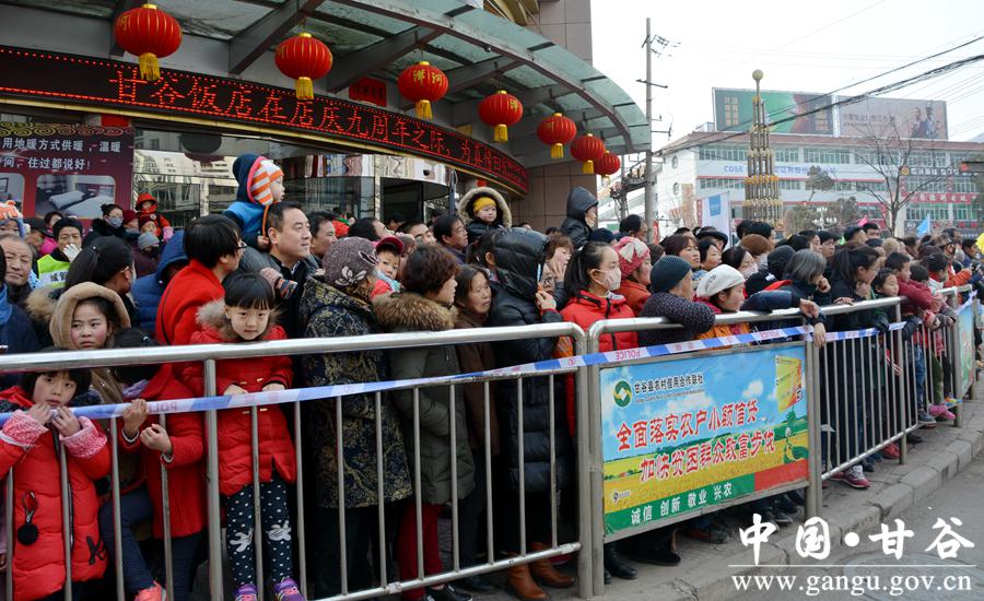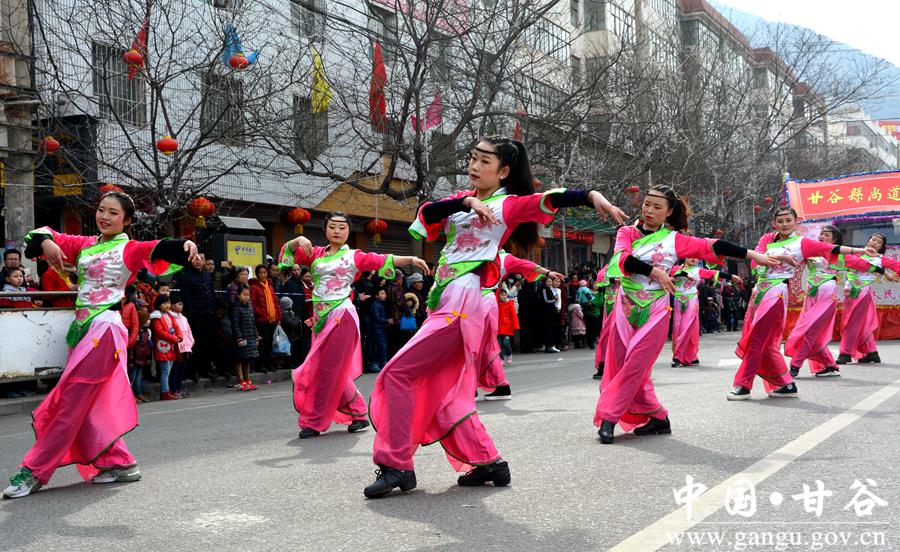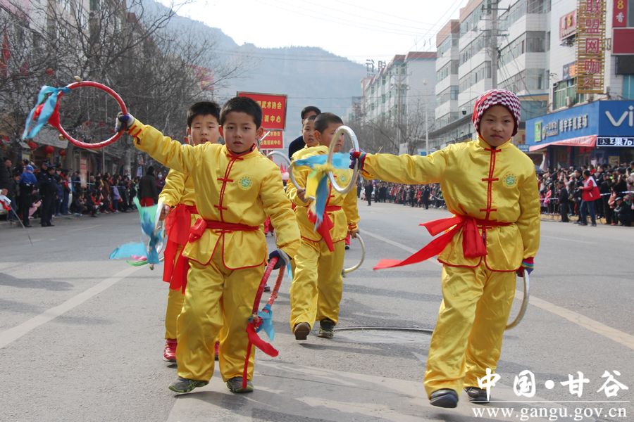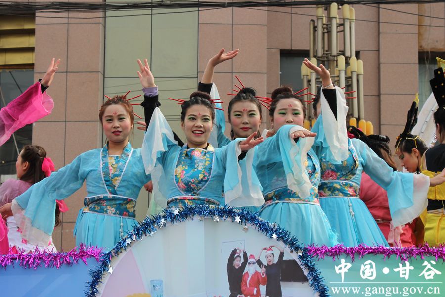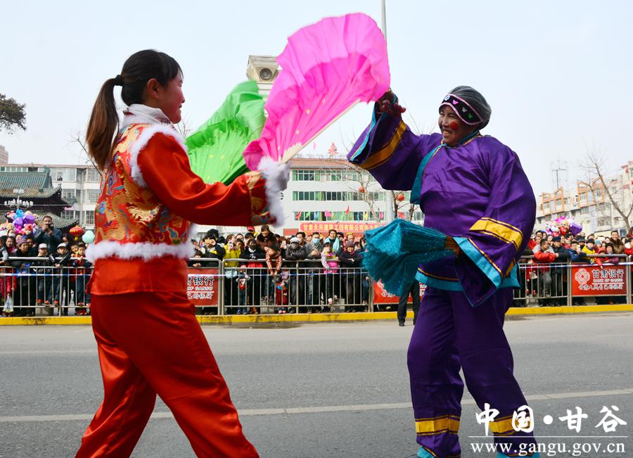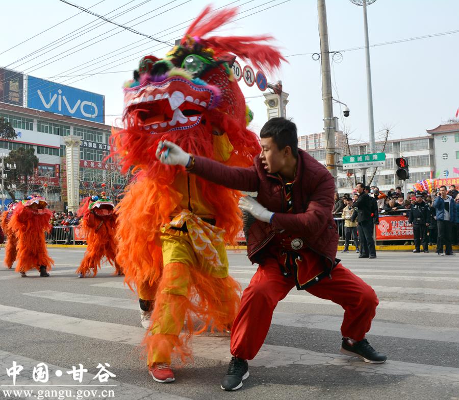 伴随着欢快喜庆的旋律,由乡镇、单位、企业组织的秧歌队从南关什字开始,自南向北沿新城路行进式表演了100多个丰富多彩的社火节目。狂奔跳跃的雄狮、腾空飞舞的长龙、独具特色的旱船、风趣幽默的舞蹈、花团锦簇的彩车、风格迥异的秦腔脸谱等地域特色鲜明、乡土气息浓厚的民俗文艺节目,集中展示了甘谷深厚的文化底蕴和特色文化建设丰硕成果,充分展现了甘谷人民喜庆盛世、共建和谐、共创辉煌的豪迈气概和昂扬向上的良好精神风貌,为鸡年春节增添了浓浓的节日气氛,给广大群众奉献了一场喜庆祥和、欢乐丰盛的文化大餐。