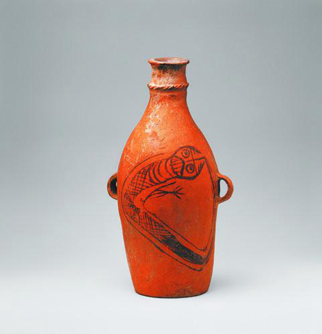 鲵鱼纹彩陶瓶,仰韶文化晚期(距今约5200年),甘谷县出土。泥质橙黄陶,陶瓶腹部以黑彩绘鲵鱼纹。鲵鱼面部似人脸状,双目圆睁,大口露牙,长条曲折状身躯首尾相接,肢爪由身体两侧伸出。该器物构图生动,展示了彩陶艺术的独特魅力和神秘意境。发现这件鲵鱼纹彩陶瓶的甘谷地区位于渭河流域,史前遗址分布密集,是中华民族发祥地之一。彩陶瓶上的鲵鱼形象或许是当时先民们对鲵鱼真实样貌的写实表现。也有专家认为,此鲵鱼形象带有一定的神秘色彩,与史籍中记载的伏羲面貌相符。还有专家认为,这件彩陶瓶上的鲵鱼形象或许就是原始的龙的形象。彩陶瓶上的鲵鱼纹被赋予了人的色彩,表达了先民们人神合一的思想,是中国彩陶中具有象征意义的代表作品。