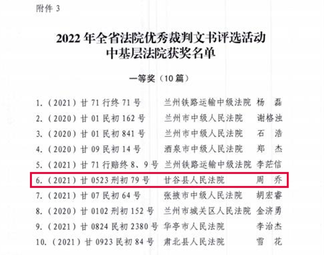 甘谷县人民法院刑事审判庭法官周乔撰写的 裁判文书(2021)甘0523刑初79号获2022年全省法院优秀裁判文书一等奖。