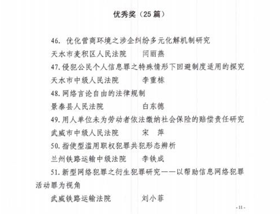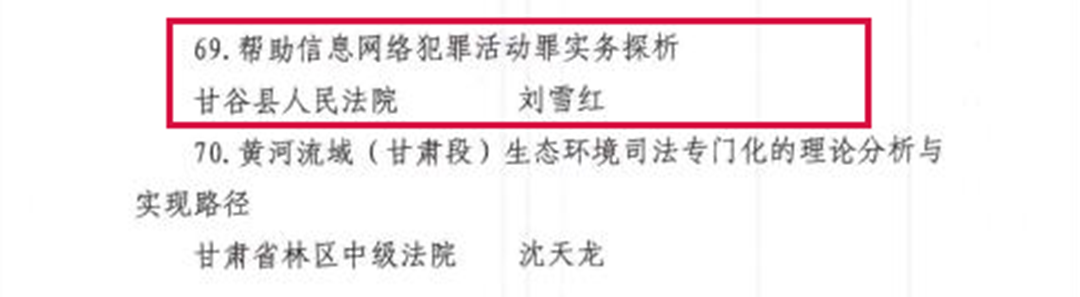 甘谷县人民法院民事审判庭法官助理刘雪红撰写的论文《帮助信息网络犯罪活动罪实务探析》获全国法院第三十四届学术讨论会暨2022年度全省法院优秀论文优秀奖。