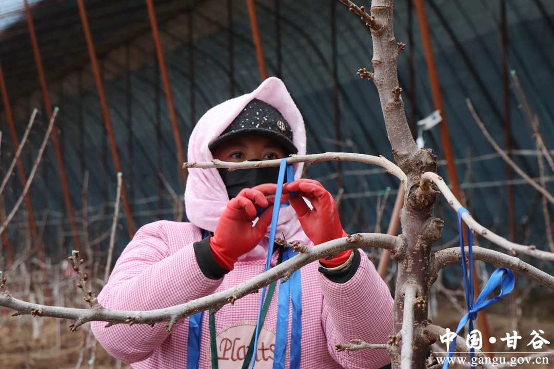 棚内的另一边,工人们也一刻不停的忙碌着。翻盘、整形、修剪、拉枝,在女工翻飞的手指下一根根五彩的布条正被系在樱桃枝上,看起来好不热闹。据管理员介绍,果树经过一年的生长,树形容易紊乱,而拉条正是为帮助樱桃树形成合理的树冠结构,促进生长,实现优质稳产的重要环节。