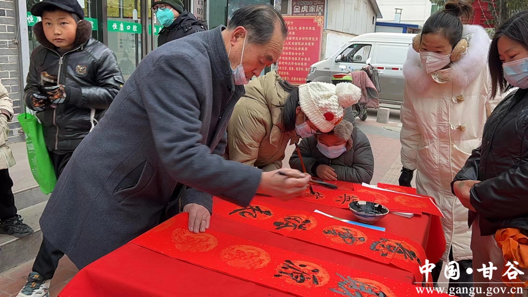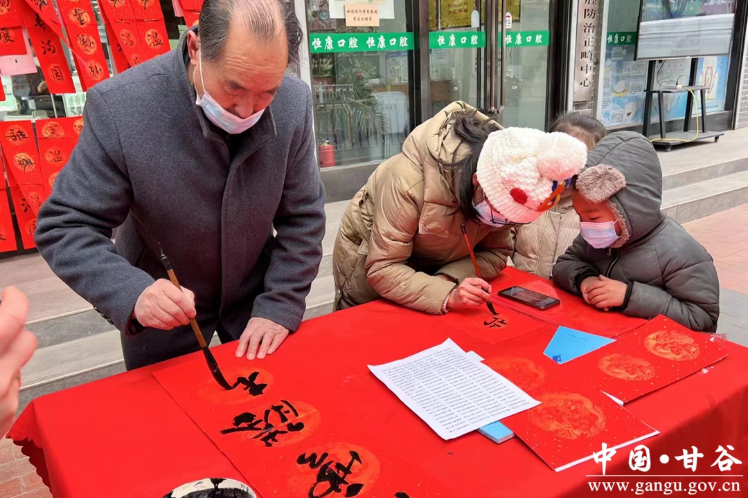 笔走龙蛇送祥瑞,翰墨留香迎新春。活动现场,一张长桌上摆满了鲜红的春联纸,市民帮忙抻纸倒墨,两位书法老师仔细润笔、精心舔墨、即兴创作。不时,一幅幅散发着墨香的红春联呈现在市民眼前。市民晾对联、收对联、选对联、评对联、忙得不亦乐乎。取得寓意美好的春联后,个个喜笑颜开。