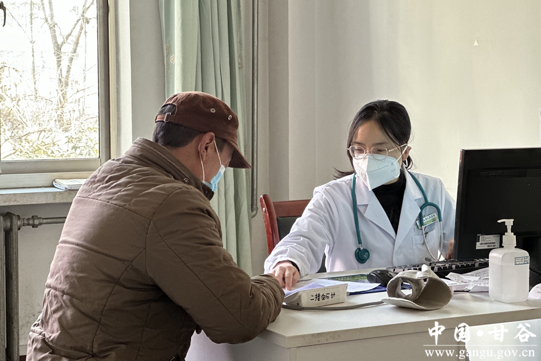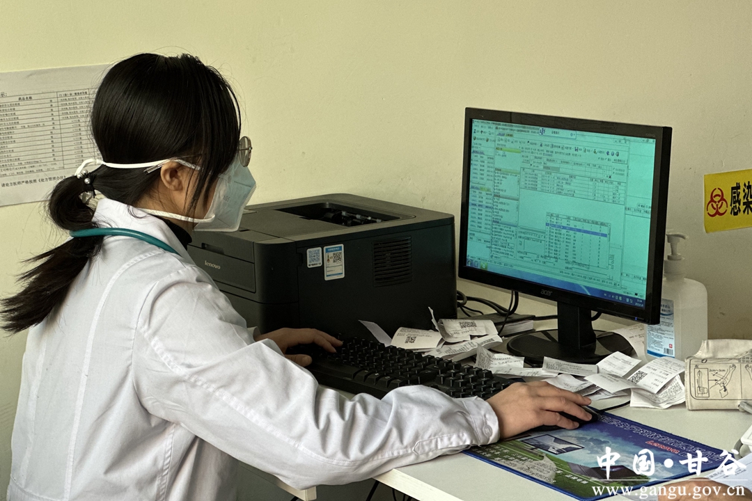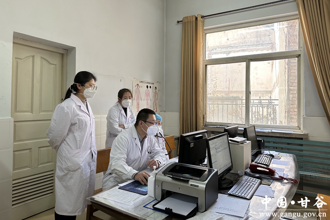 在甘谷县人民医院呼吸内科门诊,前来就诊的群众在门口排成了长队候诊,牛永红大夫正在为就诊者检查病情、询问治疗效果、制定新的治疗方案。