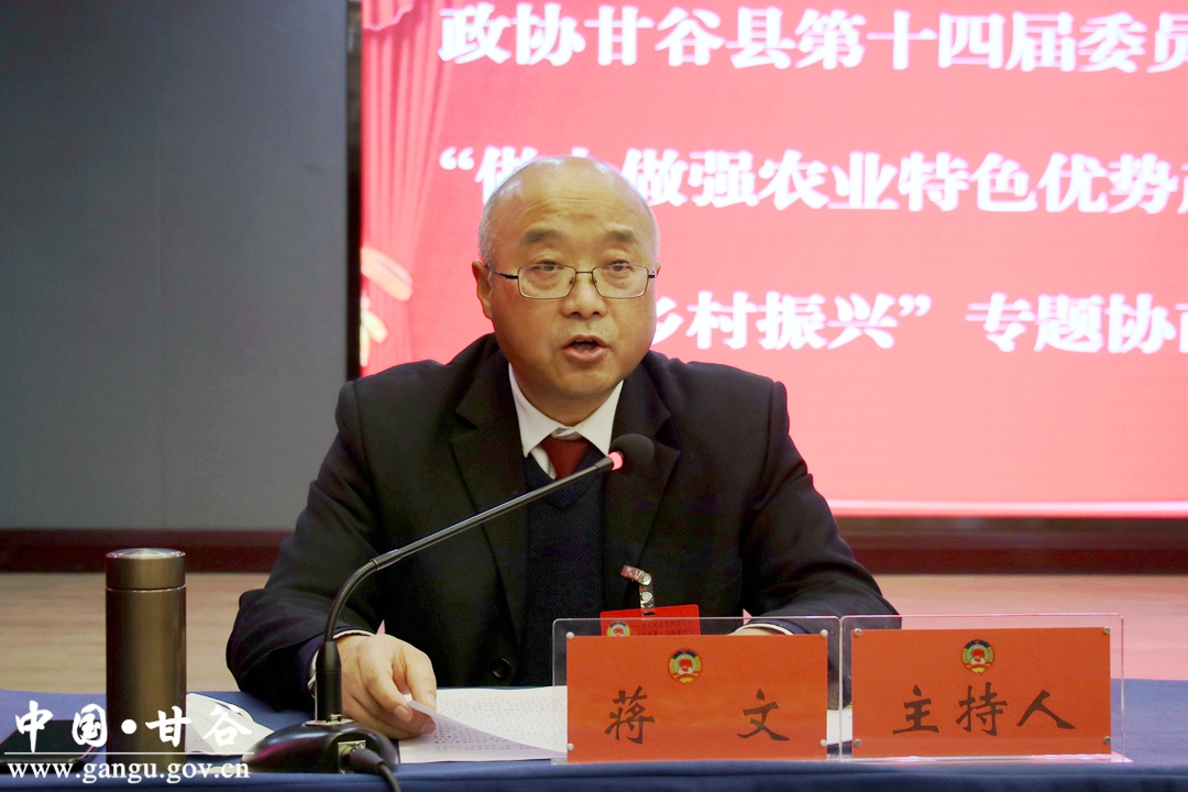蒋文强调,政协要充分发挥专门协商机构的作用,进一步完善制度机制,丰富协商内容、拓宽协商渠道、提高协商效果。各位政协委员要认真履职尽责,主动担当作为,深入调查研究,积极建言献策,增强为培育壮大农业特殊产业、全力助推乡村振兴建言献策的责任感和使命感,加强民主协商,集各方智慧,使做大做强农业特色产业过程成为汇集各方智慧、凝聚大家共识的过程。各位政协委员要提高履职能力,做到“懂政协、会协商、善议政、守纪律、讲规矩、重品行”,经常深入基层摸实情,主动担当作为,为做大做强农业特色产业、全力助推乡村振兴、建设和谐幸福美好新甘谷作出新贡献。