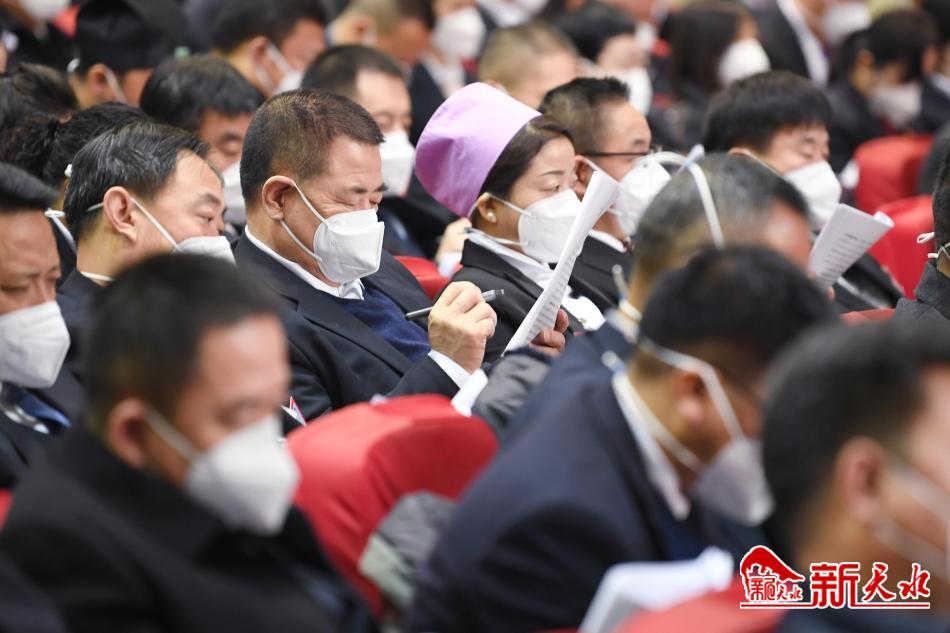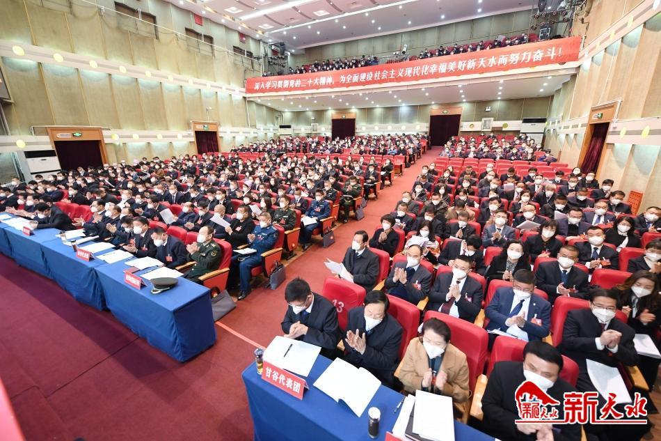 当天的秦州大剧院内气氛庄重热烈,主席台帷幕正中的国徽在鲜艳的红旗映衬下熠熠生辉。会场内悬挂着“深入学习贯彻党的二十大精神,为全面建设社会主义现代化幸福美好新天水而努力奋斗”的横幅标语振奋人心。