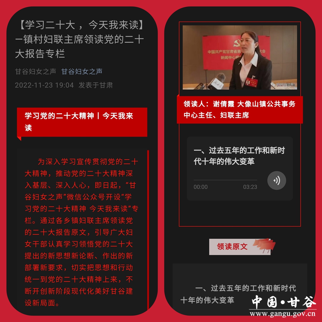 四、引导妇女“自我”学。依托“甘谷妇女之声”公众号平台,积极向广大妇女推送主流媒体和新媒体党的二十大学习资源,推送名家教授解析、权威理论文章和各类报刊社评。同时开设“专栏,畅通个人自学渠道,鼓励广大妇女群众运用学习强国APP、甘谷党建APP、新甘谷APP、电视等妇女喜闻乐见的媒体平台展开自学。