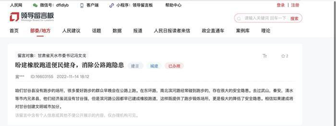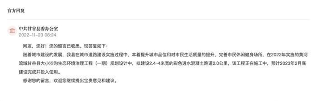 针对群众的留言,中共甘谷县委办公室回复表示,随着城市建设的发展,甘谷县在城市道路建设实施过程中着力提升城市品位和市民生活质量,完善市民休闲健身场所,在2022年实施的黄河流域甘谷县大小沙沟生态环境治理工程(一期)规划设计中,拟建设2.4至4米宽的彩色透水混凝土跑道2.0公里,该工程正在施工中,预计2023年2月底建设完成并投入使用。