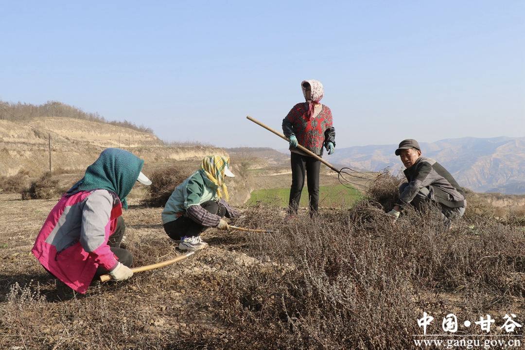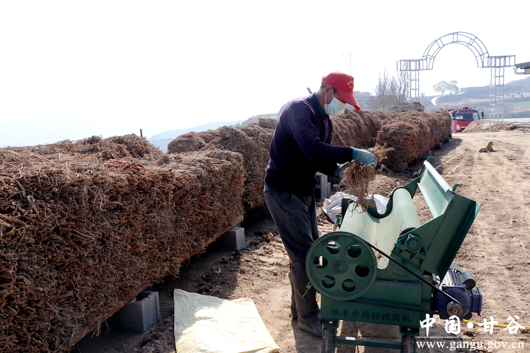 而在甘谷县烁烁种植农民专业合作社,负责人贾万同正在指导20多名工人修剪、筛分一捆捆晾晒的黄芪,在工人初加工后,分成不同等次的黄芪,再经过一段时间的晾晒便可进行销售。