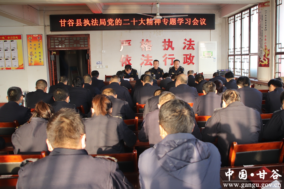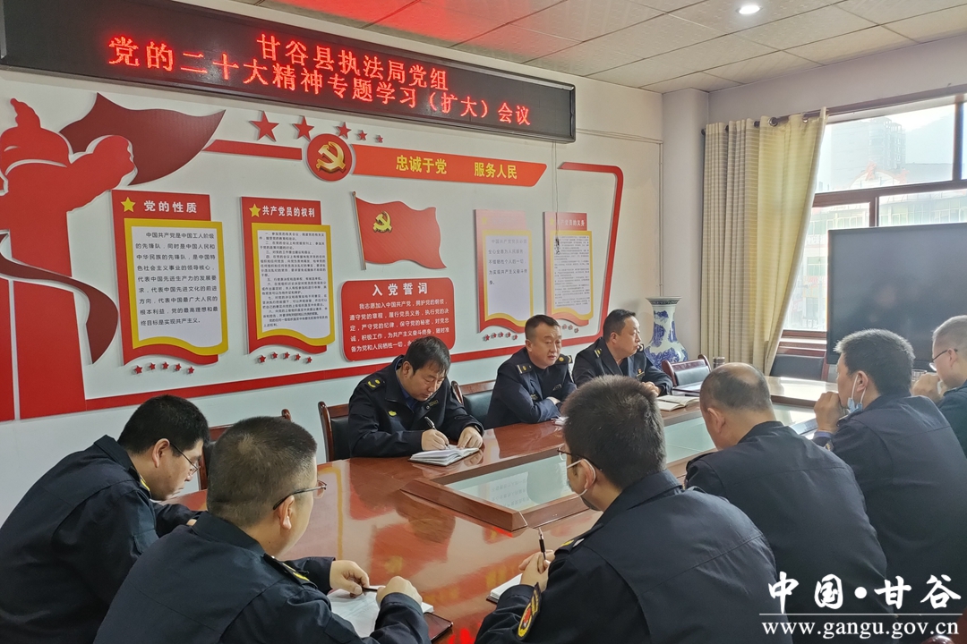 为深入学习贯彻党的二十大精神,连日来,甘谷县执法局分别组织召开党组学习(扩大)会议和全体干部职工学习会议,专题学习党的二十大精神。