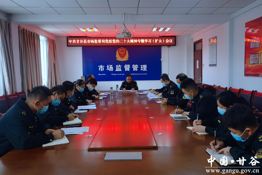 近日,中共甘谷县市场监督管理局党组召开理论学习中心组学习扩大会议,专题学习党的二十大精神,研究部署全局系统学习宣传贯彻工作。局党组书记、局长宋红军主持会议并讲话,局党组成员、各股室负责人参加会议。