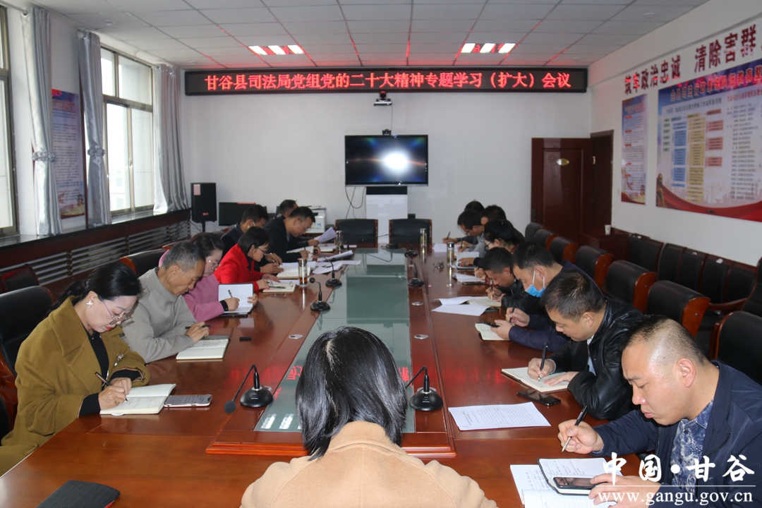 10月27日,甘谷县司法局召开党组(扩大)会议,专题学习习近平总书记在党的二十大闭幕会议上的重要讲话精神、中国共产党第二十次全国代表大会关于十九届中央委员会报告的决议、中国共产党第二十次全国代表大会关于十九届中央纪律检查委员会工作报告的决议、关于《中国共产党章程(修正案)》的决议和人民网评“用新的伟大奋斗创造新的伟业”,并对全系统学习宣传贯彻党的二十大精神再安排、再部署。局党组成员和各股室负责人参加会议。