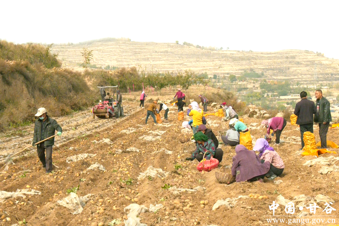 在甘谷县八里湾镇中岔村的山坡地里,采收机械来回穿梭,农户们正在捡拾、装袋刚出土的马铃薯,一片繁忙的景象。合作社负责人告诉记者,他们已经忙碌了近一周,这几天即将采收完毕。
