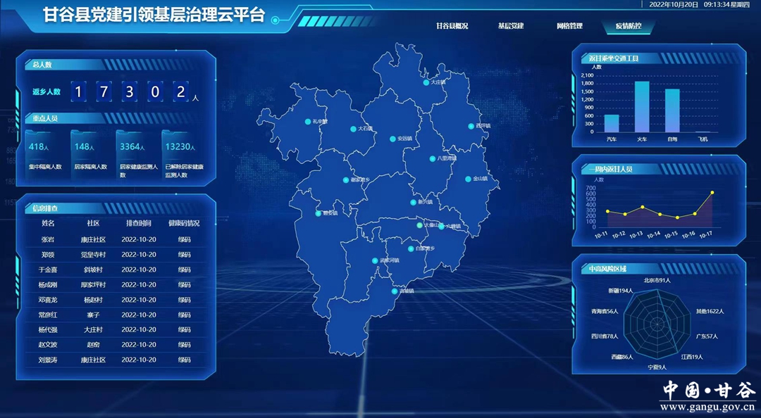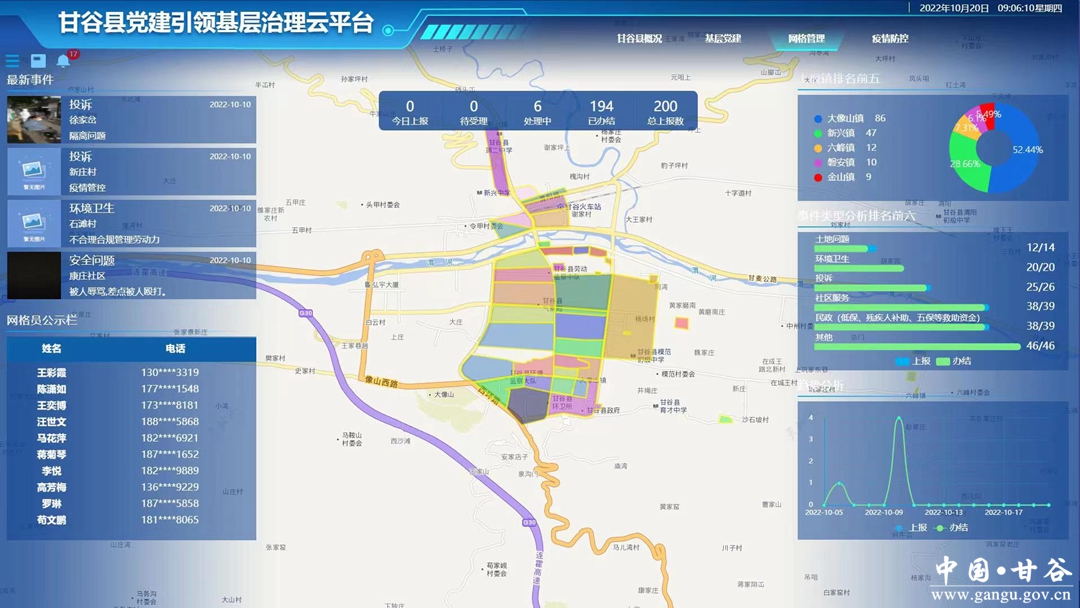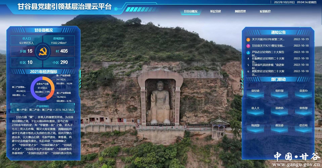 甘谷县党建引领基层治理云平台主要涵盖基层党建、基层社会治理、协同平台、疫情防控、心愿墙、人才库管理、报名考试、招商资讯、移动端、大数据可视化等10个板块。该平台依托网格化管理和网络技术,畅通企业和群众诉求反映渠道,健全问题排查、平台受理、分析研判、分流交办、全程监督,以利民、为民、便民为重点,着力保障和改善民生,做到“民有所呼、我有所应”,让人民群众共享智慧社会建设成果。截至目前,平台注册用户己超过40万余人。