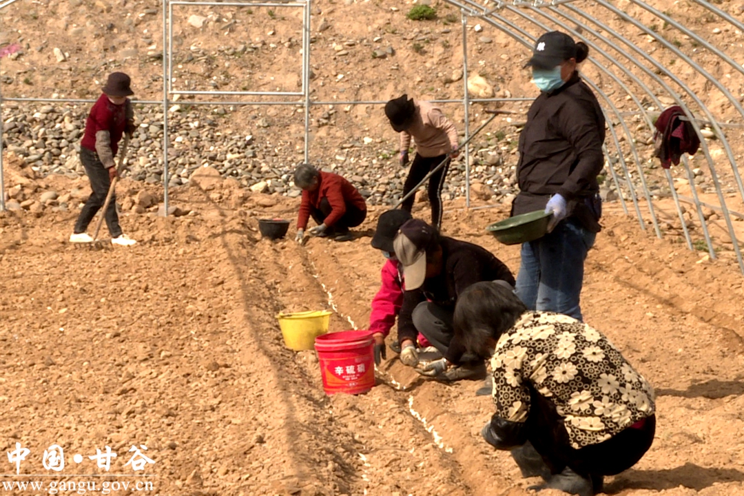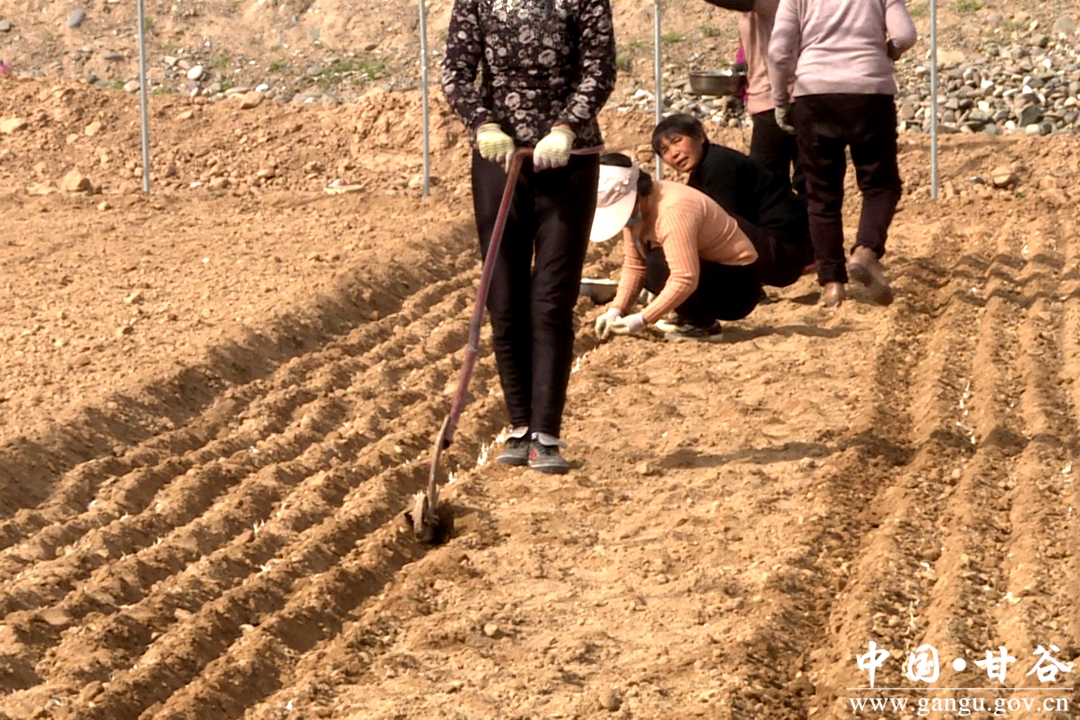 甘谷县丰昌种植农民专业合作社务工者王改琴说,最近家里没有活,我联系了一帮姐妹儿,正好大棚里也需要种蒜的人,我们到这种一段时间的蒜,在家里挣点零花钱。