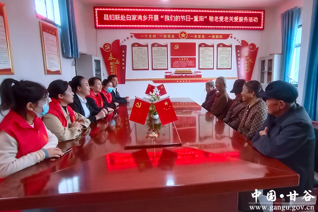 在重阳节来临之际,为弘扬中华民族尊老敬老的传统美德,进一步倡导敬老、爱老、助老的新风尚,让留守老人度过一个温馨愉快的国庆和重阳佳节。近日,甘谷县妇联一行深入白家湾乡开展我们的节日——重阳”敬老爱老关爱服务活动。