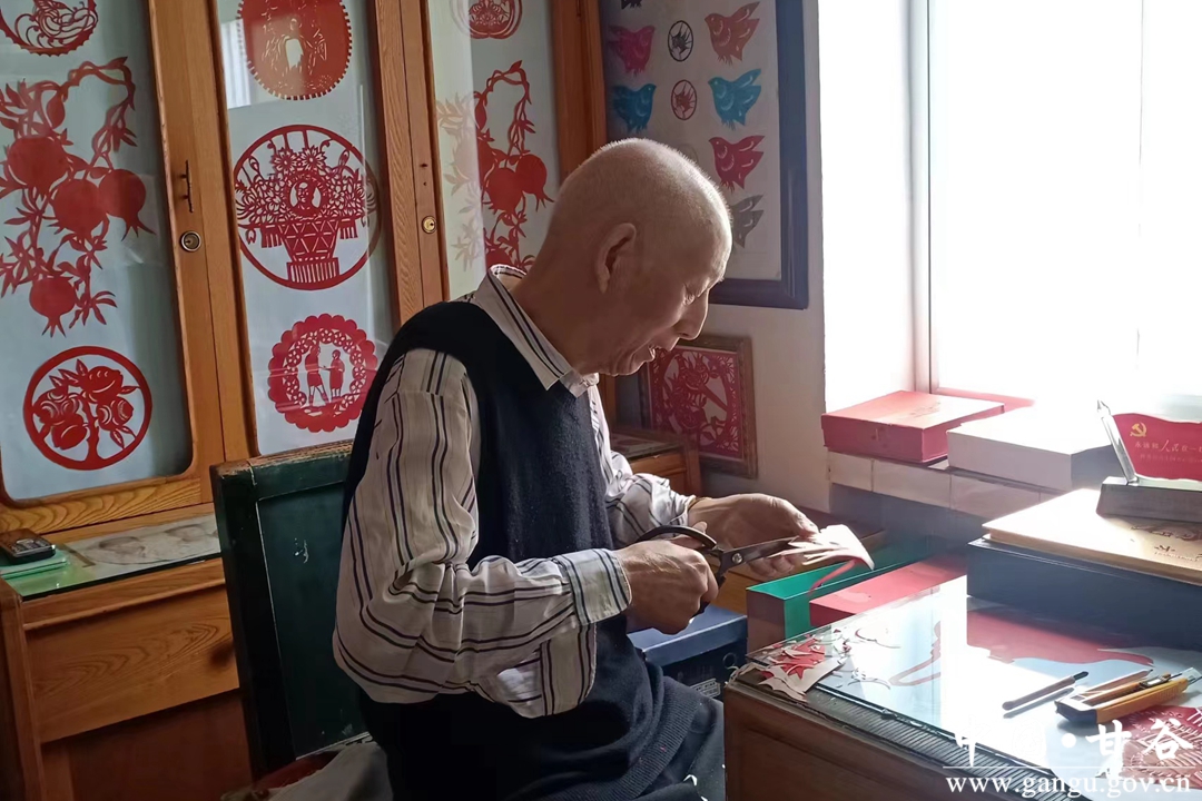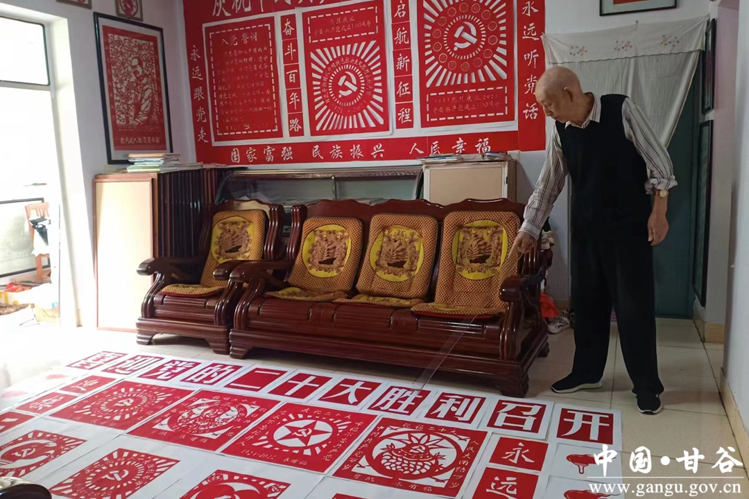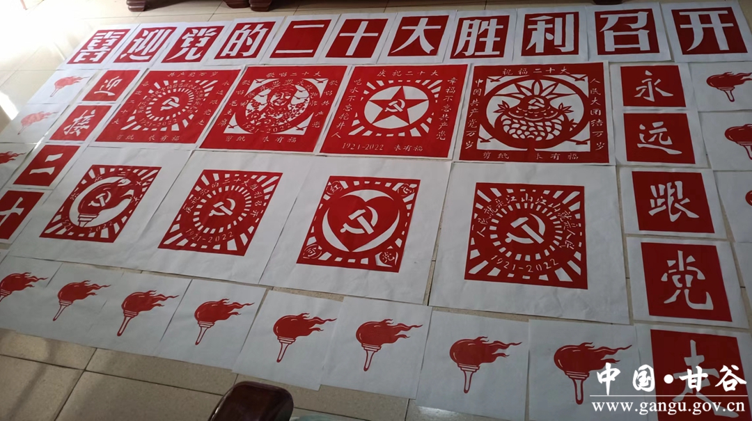 数十年来,他用剪刀和刻刀将自己的赤诚之心剪刻在一沓又一沓红纸上,创作出了一幅幅主题鲜明、富含寓意的剪纸艺术作品。今天就让我们跟随摄像机镜头,一起走进甘谷县民间剪纸老艺人—朱有福家,共同欣赏“喜迎二十大”系列剪纸艺术作品,一饱眼福。