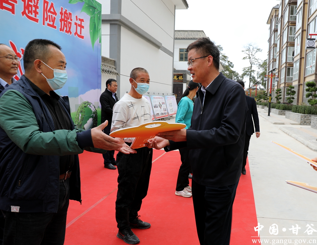 入住仪式上,孙忠平为喜迁新居的群众交付新房钥匙。六峰镇汇报介绍了全镇生态及地质灾害避险搬迁工作整体情况。