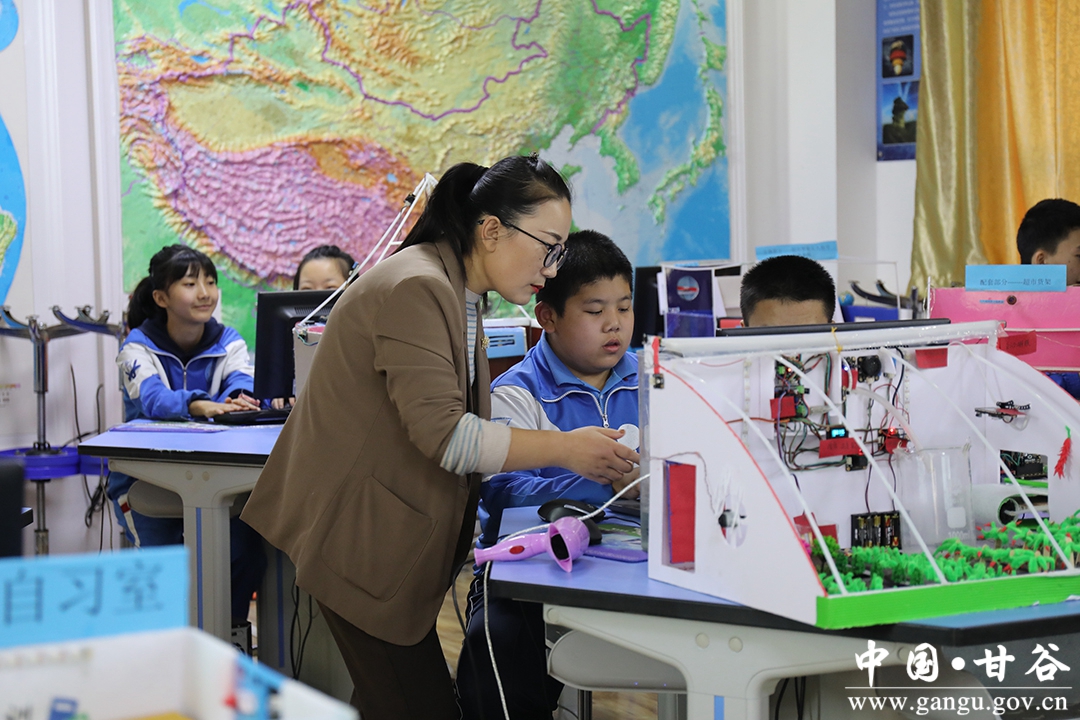在甘谷县模范初级中学创客室里,老师们正在指导学生完善创客作品。这些作品涉及农业、环保、智能自动化等方面,充分展现了学生们丰富的创造力。
