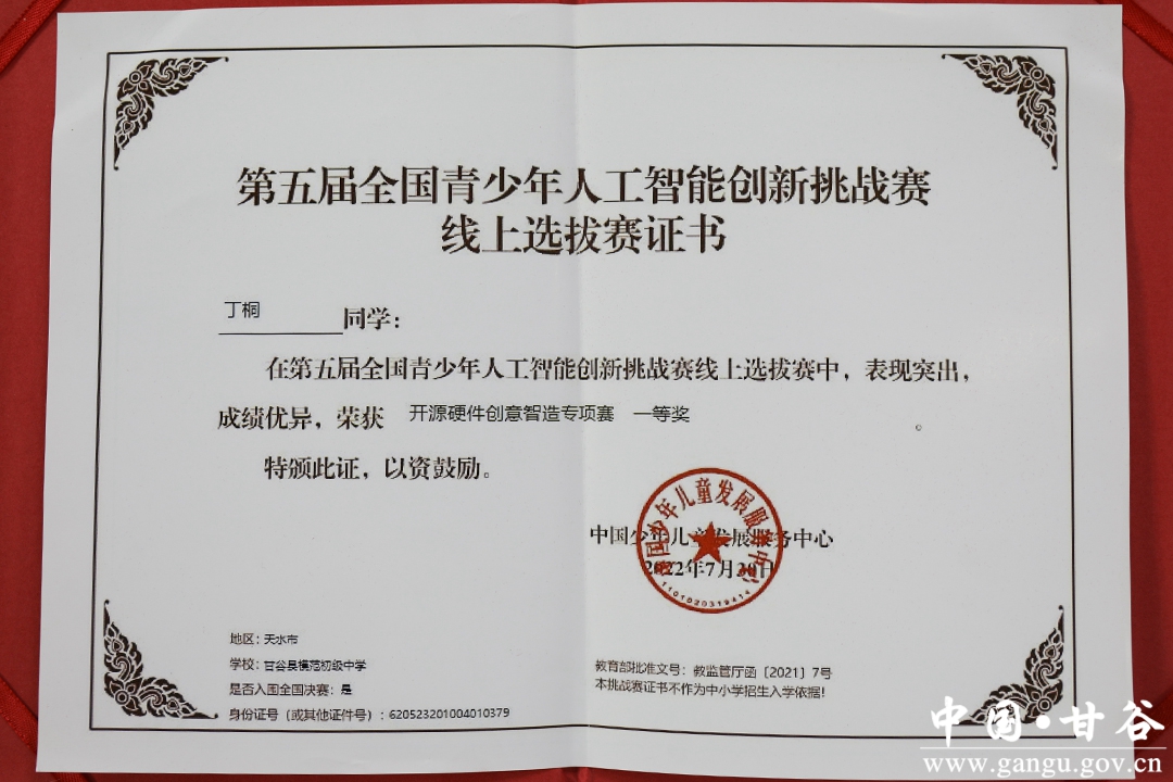 近日,记者从甘谷县教育局获悉,甘谷县模范初级中学创客室小“创客”继去年获得全国赛事荣誉后,又在今年的“第五届全国青少年人工智能创新挑战赛开源硬件创意智造专项赛”中,荣获赛事一等奖。