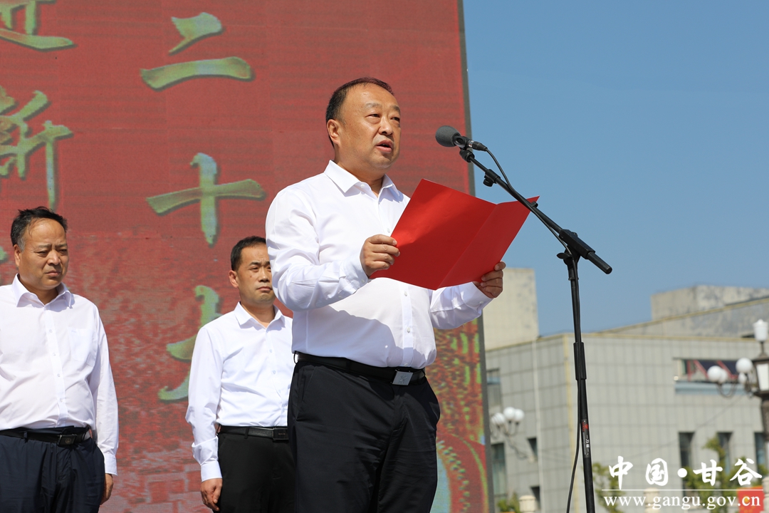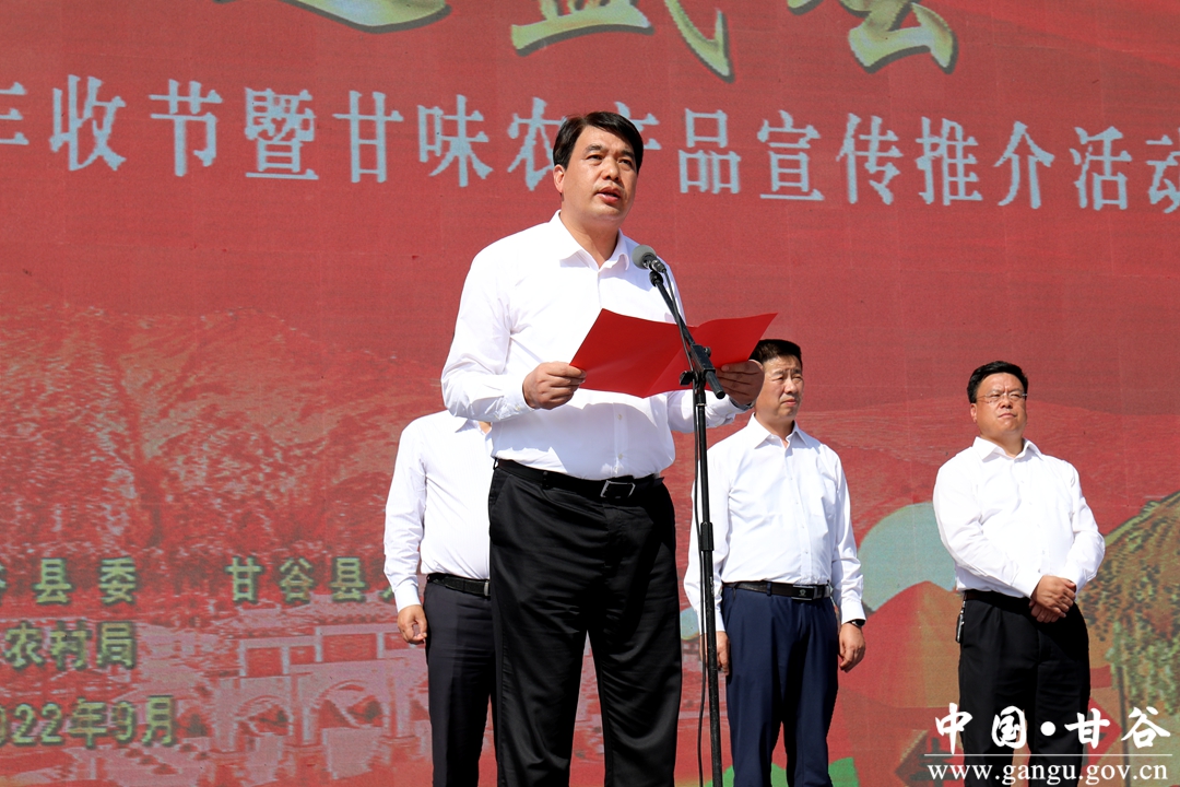 吴健代表甘谷县四大组织,向各位领导、各位来宾及新闻界的朋友们表示热烈的欢迎和衷心的感谢,向全县农民朋友们致以诚挚的问候和美好的祝福。他说,近年来,县委、县政府深入学习贯彻习近平总书记关于“三农”工作的重要论述,立足“农业优先”型发展定位,紧盯“产业兴旺”这一目标,大力发展果椒、蔬菜、中药材、养殖等优势产业,全力保障粮食安全和重要农产品供给,加快构建现代农业产业体系,建成了北部山区旱作农业、渭河川道区设施蔬菜、南后山区高原夏菜三大基地和南北浅山两个百里林果产业带,全县粮食种植面积达到76.1万亩,苹果36万亩、花椒22万亩、蔬菜30.3万亩、中药材7.1万亩、辣椒4.3万亩,畜禽饲养量达到263万头(只),为推动乡村全面振兴打下了坚实基础、提供了有力支撑。