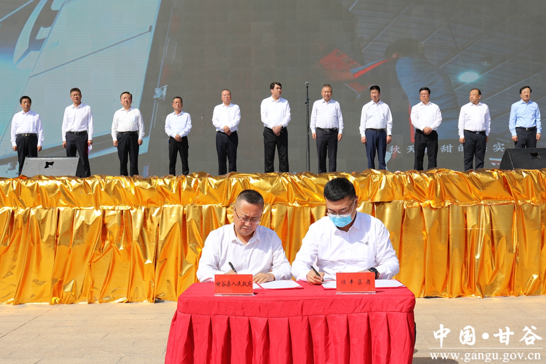 (副县长刘强代表县政府与顺丰集团甘青区市场销售总监任洪亚签订顺丰助力甘谷苹果营销框架协议)