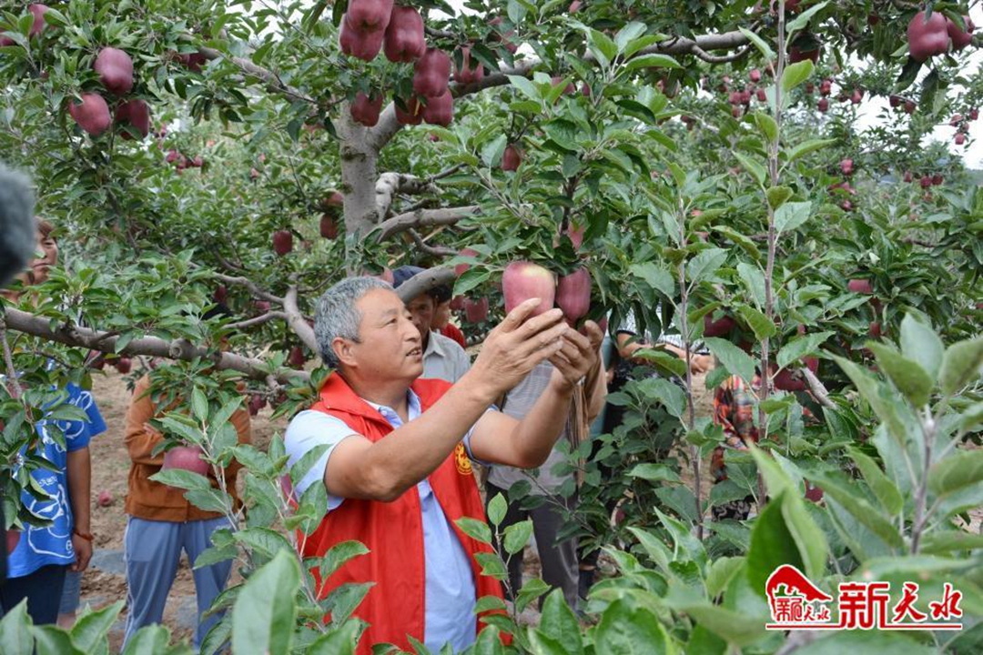 “我们今天在园子里培训的主要内容是摘叶、转果,让果子提高增色的面积,让果子达到全红。还有就是疏除,剪掉一些强旺枝,确保果树通风,增加光照条件,力争果子都是优质果,能卖上好价钱。”当天,种植苹果已有30余年的果农李成生作为志愿者站在苹果树旁,一边讲着田间管理知识,一边在现场手把手指导着果树管理的方式方法。