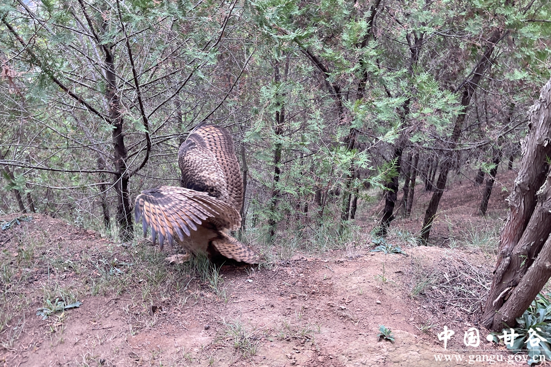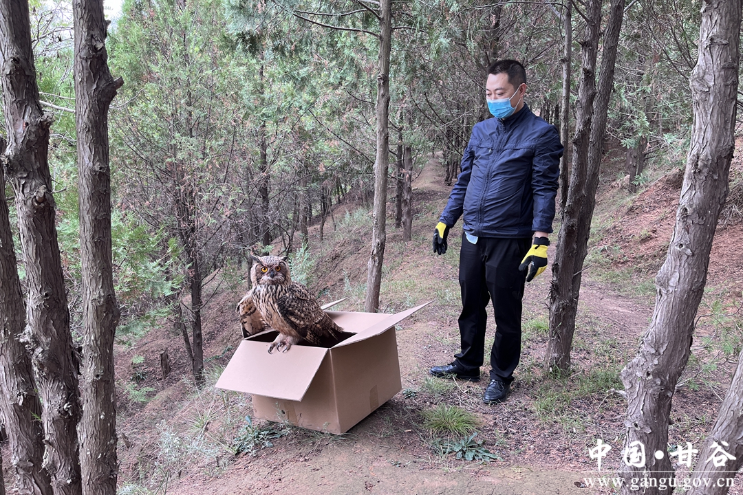 经检查雕鸮并未受伤,随后甘谷县林草局对雕鸮采取喂食、饮水等救助措施,经过休整栖息,在天门山林地内进行了放生,让它回到大自然的怀抱。
