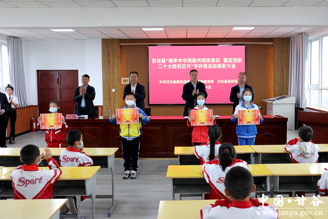 9月14日,甘谷县“铸牢中华民族共同体意识、喜迎党的二十大胜利召开”为主题的“石榴杯”手抄报活动表彰大会在伏羲学校举行,表彰民族团结进步创建工作中的先进典型,引领各族师生积极投身我县民族团结进步创建工作,进一步铸牢中华民族共同体意识。县委常委、统战部部长王见学出席会议并讲话。县委统战部、县教育局负责人,各学区校长、获奖作品指导老师、获奖学生和伏羲学校部分师生代表参加会议。