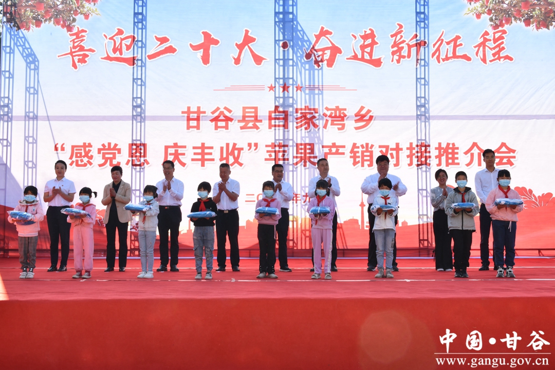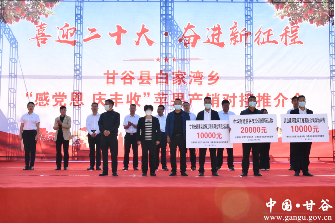 启动仪式上,白家湾乡党委书记姜芳芳致辞,县果业中心主任蒋旭明介绍推介白家湾乡苹果。康苹果业、诚信果业、苟家岘村农民供销互助合作社、甘谷县成林果业农民专业合作社等4家单位与采购方签订了采购协议。中华财险甘谷支公司、武山建阳建筑工程有限公司、甘肃宏泰展荣建筑工程有限公司等3家单位依次进行了现场认购。活动还进行了“情暖童心”爱心校服捐赠。