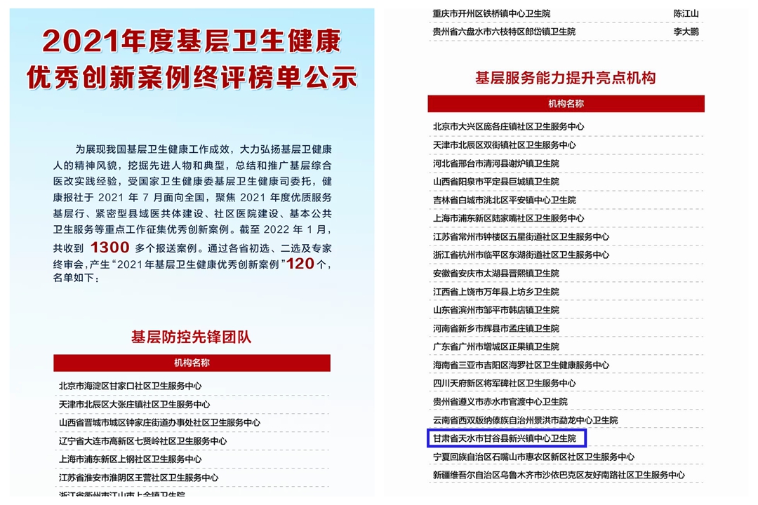 8月26日,由国家卫生健康委基层卫生健康司指导,健康报社和浙江省卫生健康委联合主办的第三届基层卫生健康发展与传播大会暨基层卫生重点工作交流会上,甘谷县新兴镇中心卫生院荣获2021年“优质服务基层行”基层服务能力提升亮点机构。