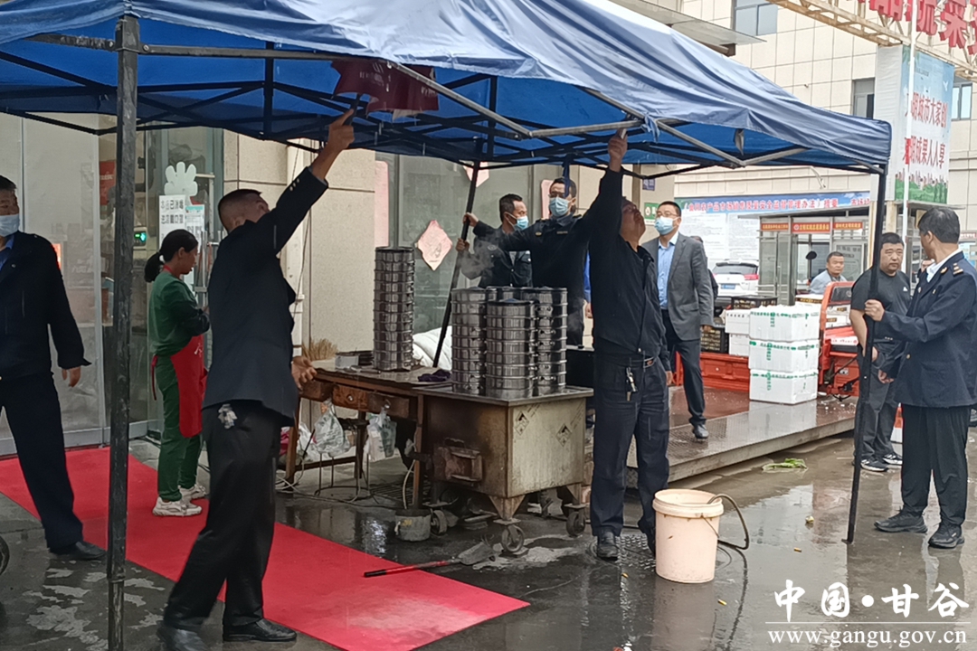 近日,为保证西城区果蔬批发市场入市搬迁工作顺利开展,甘谷县执法局联合县市建中心、甘谷县物流园区管委会、甘谷县公安局交警大队向社会发布了《关于西城区果蔬批发市场启用暨西城区城市环境综合治理的通告》,对西城区周边果蔬商贩进行了入市搬迁前的大力宣传。